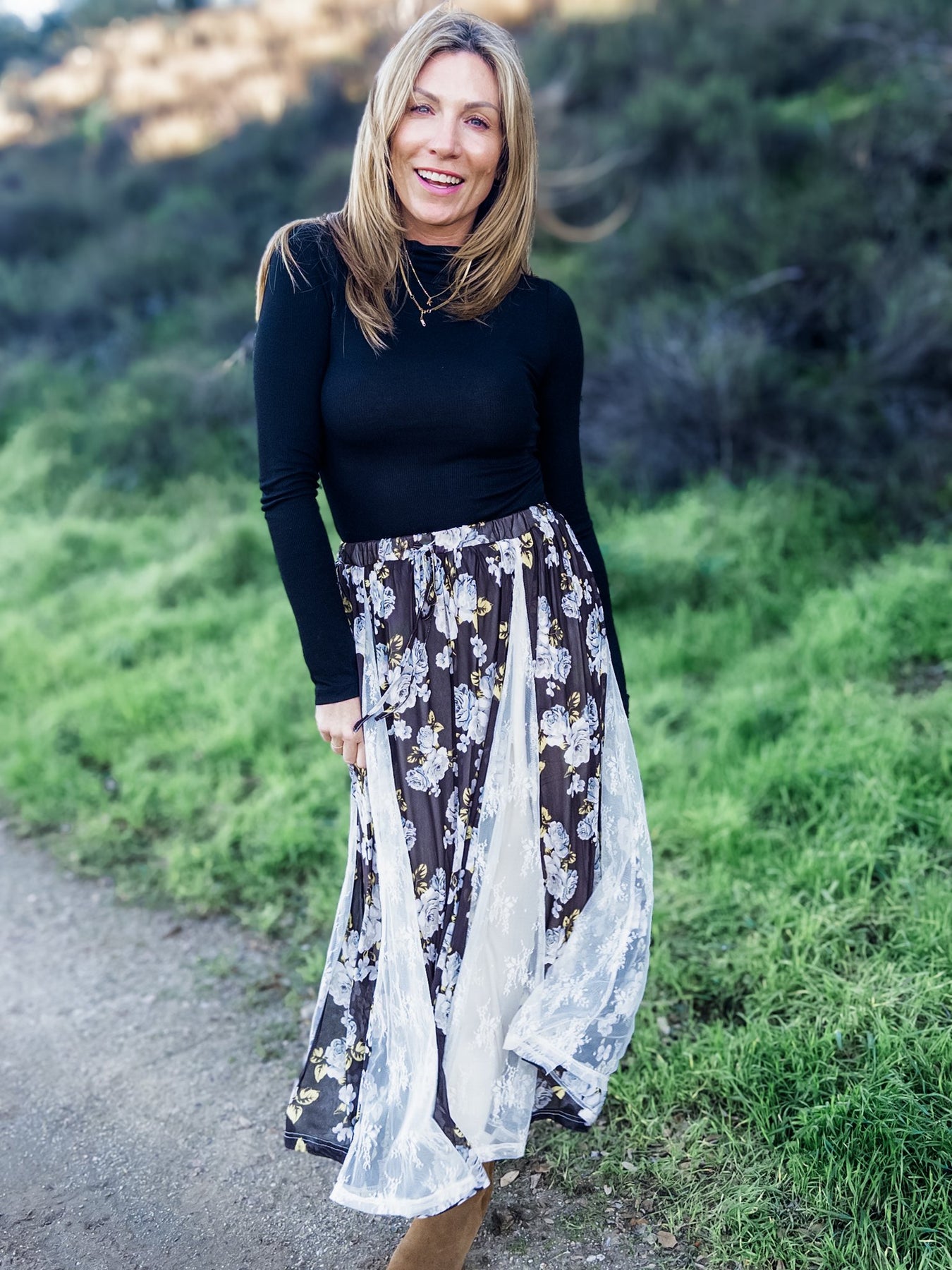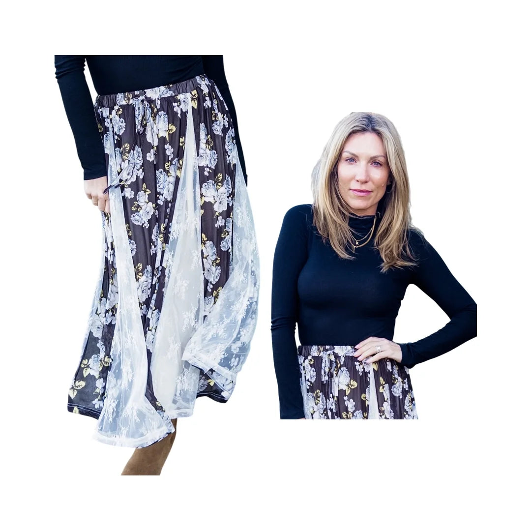 The perfect styled look from Kelly and Kasey, to go from coffee to cocktails, or wherever the day may take you! This look includes our Set Apart Lace Midi Skirt, with a flexible and comfortable elastic waistline and fun lace and floral panel details.