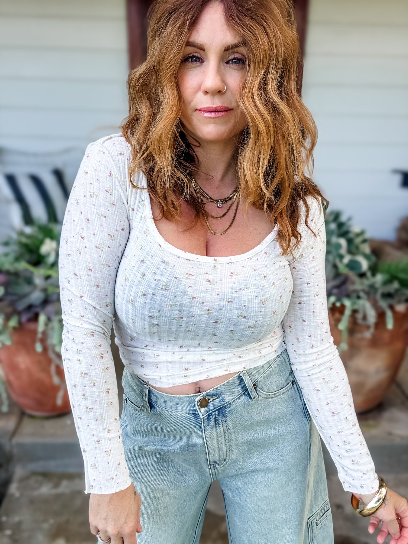 Why we LOVE it: This sweet top will carry you through the cooler months, layered under a cardigan as a basic with detail and pattern for a bit of interest, and into the spring as a timeless top to pop on with just about anything!