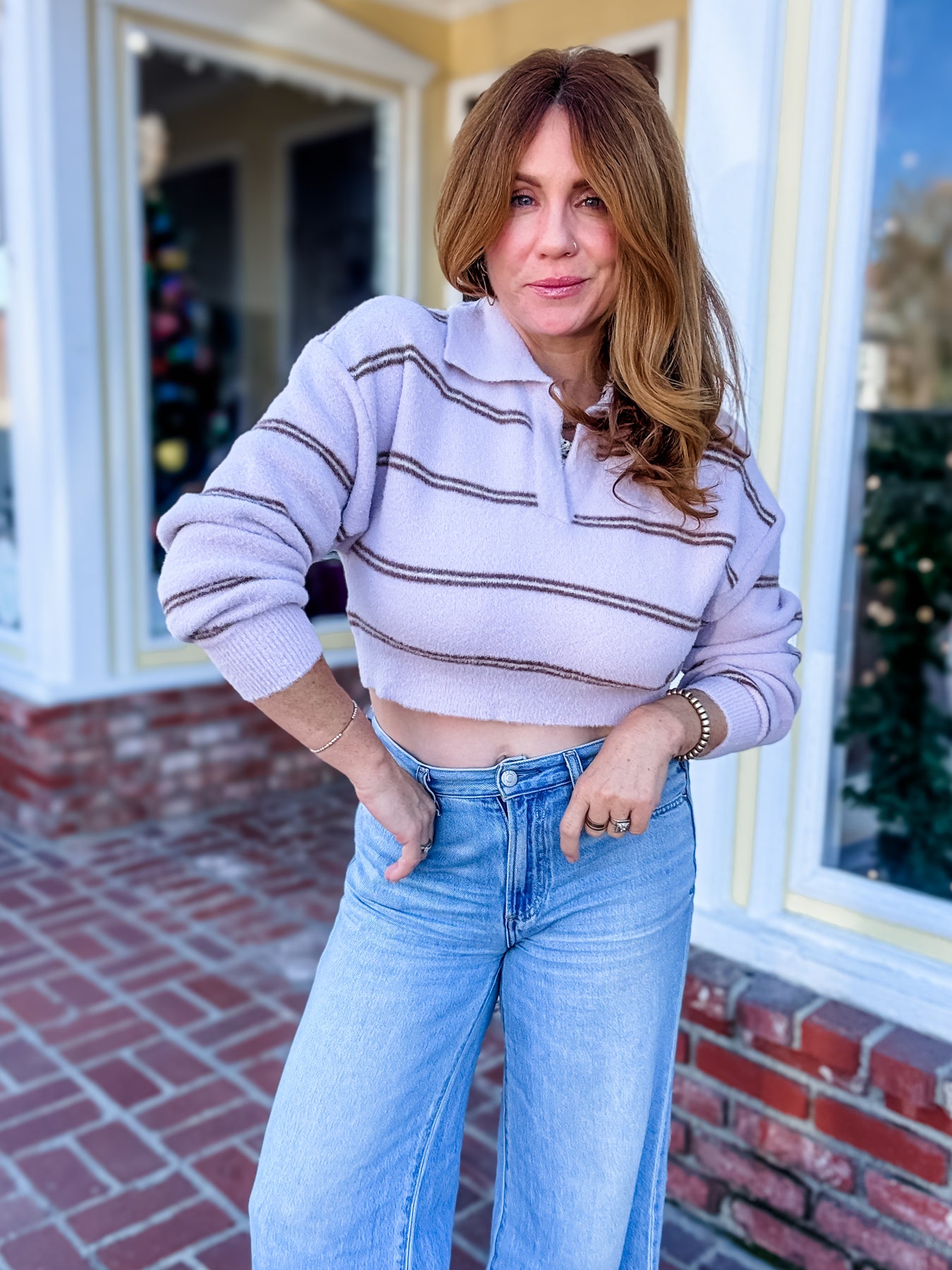 Meet your new laid-back essential — the Lavender Lane Striped Knit Polo. This cozy, soft-touch sweater features a relaxed polo collar, subtle v-neckline, and wide ribbed hem for an effortlessly flattering fit. Designed in a dreamy lavender hue with clean horizontal contrast stripes, it blends casual charm with an elevated feel. The slightly cropped silhouette pairs perfectly with high-waisted denim, trousers, or casual skirts, making it a go-to for easy everyday styling.