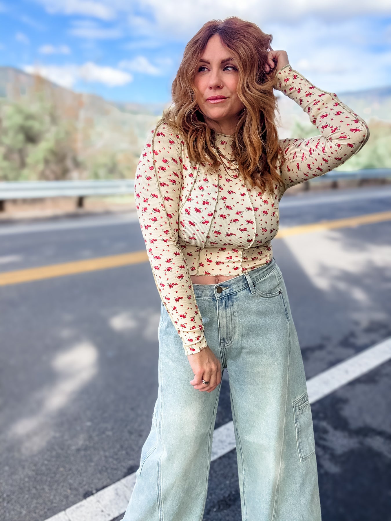 OBSESSED with this Spring Forward Daytime look, featuring our brand new Darla's Garden Long Sleeve in a bright and poppy yellow and pink colorway. She fits like a dream, stretchy and easy to pair with these must have cargo jeans! Loose and a lower fit (I sized up) with a slight barrel style leg. I wore this entire fit when I shot the look, and fell in love! Knew it needed to be featured as a head to toe look.
