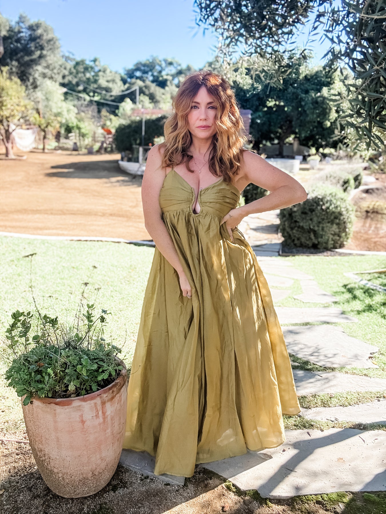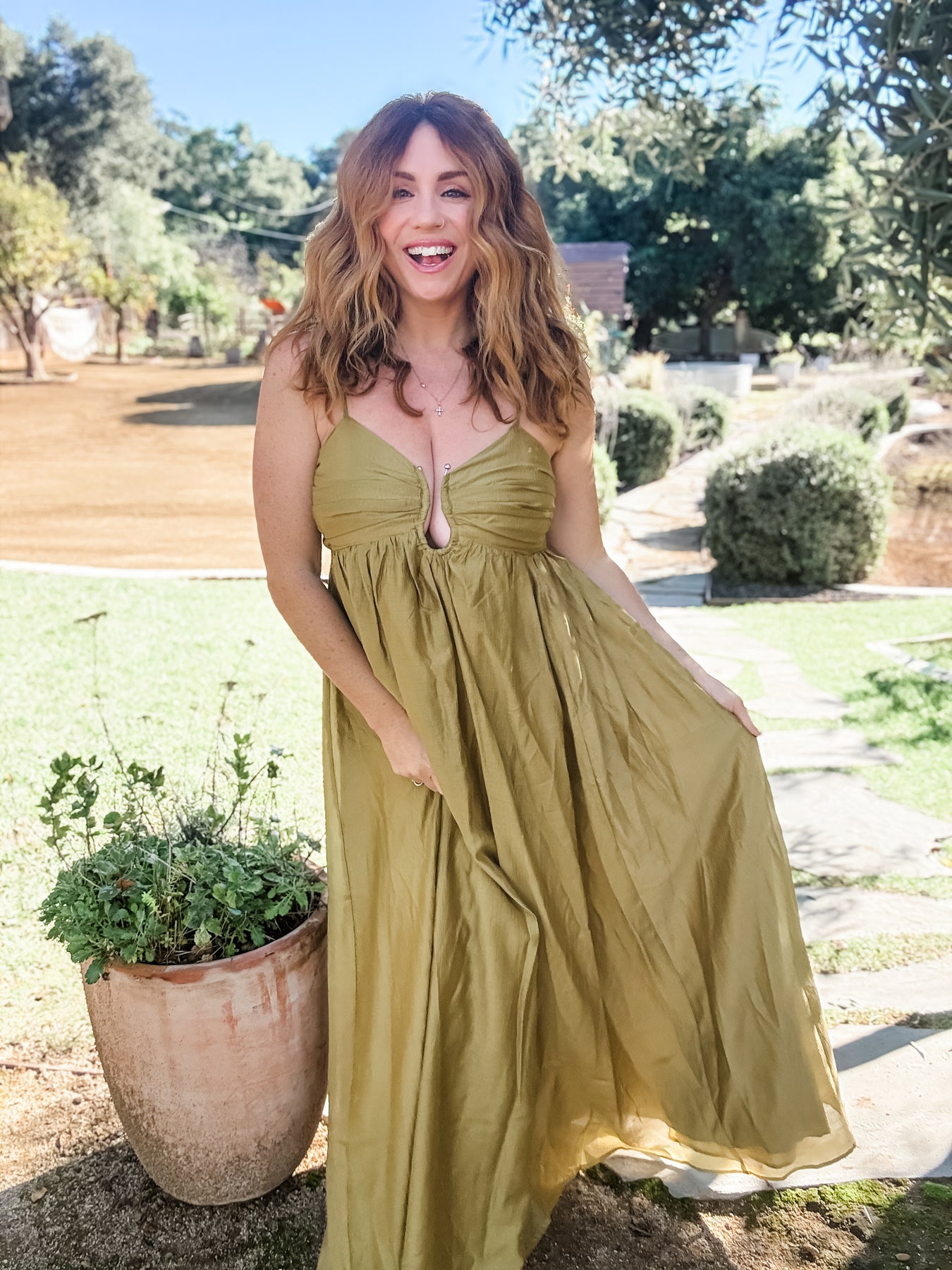 FIT: This beautiful dress has an empire waist hitting right below the bust with a flowy skirt and a maxi length.