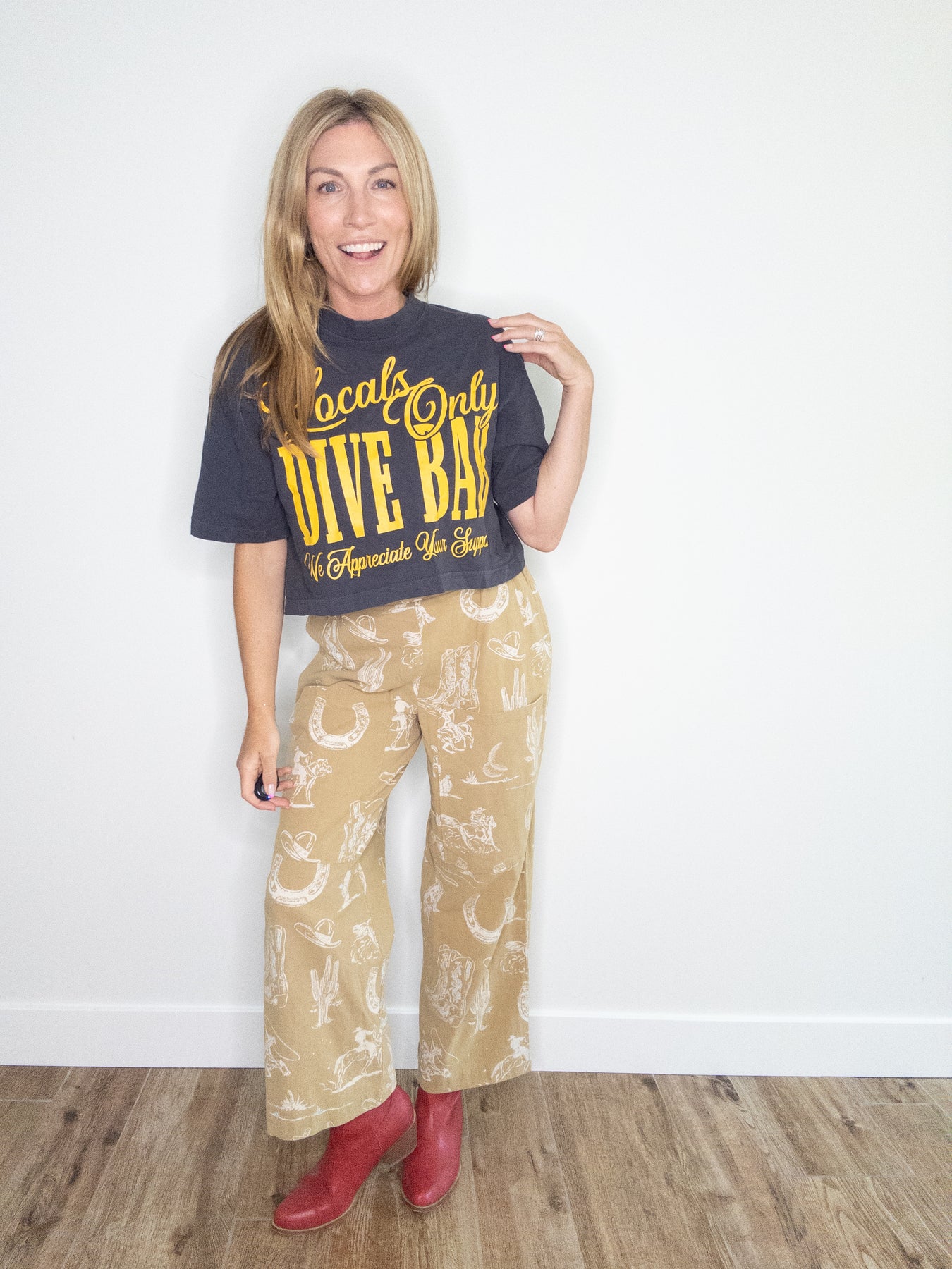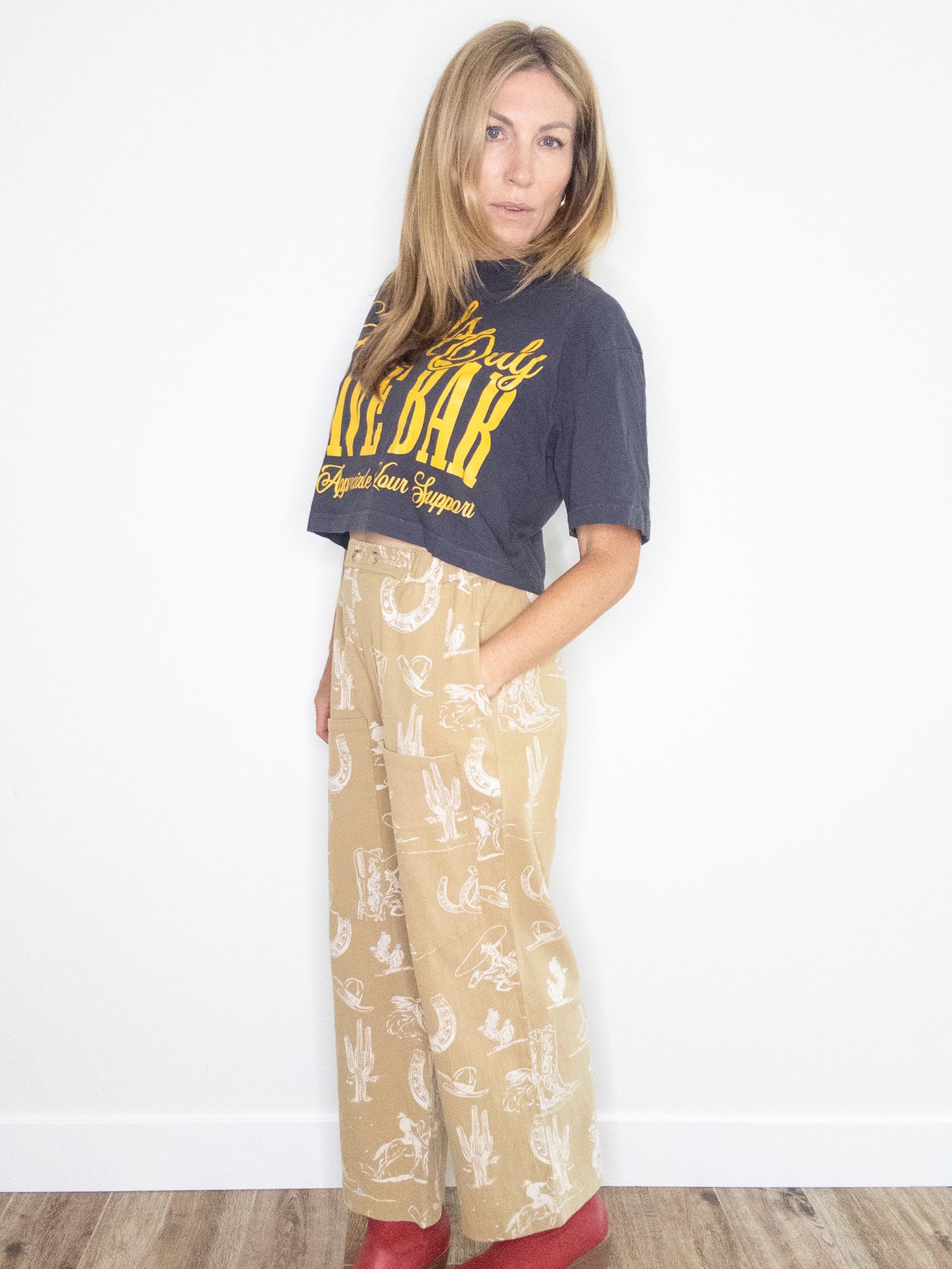 Step into easygoing western flair with our Get Rowdy Western Motif Wide Leg Pants. Featuring a sandy camel base with playful white and light blue cowboy-inspired motifs—boots, hats, cacti, and more—these pants bring a touch of desert charm to your everyday look. The relaxed wide-leg silhouette offers all-day comfort while keeping your style effortlessly chic. The pull on silhouette with elastic back, fixed button detail and front pleating plus side pockets make for the perfect fit. Pair them with a graphic tee and boots for a laid-back cowgirl vibe or dress them up with a crisp blouse for a modern western twist.