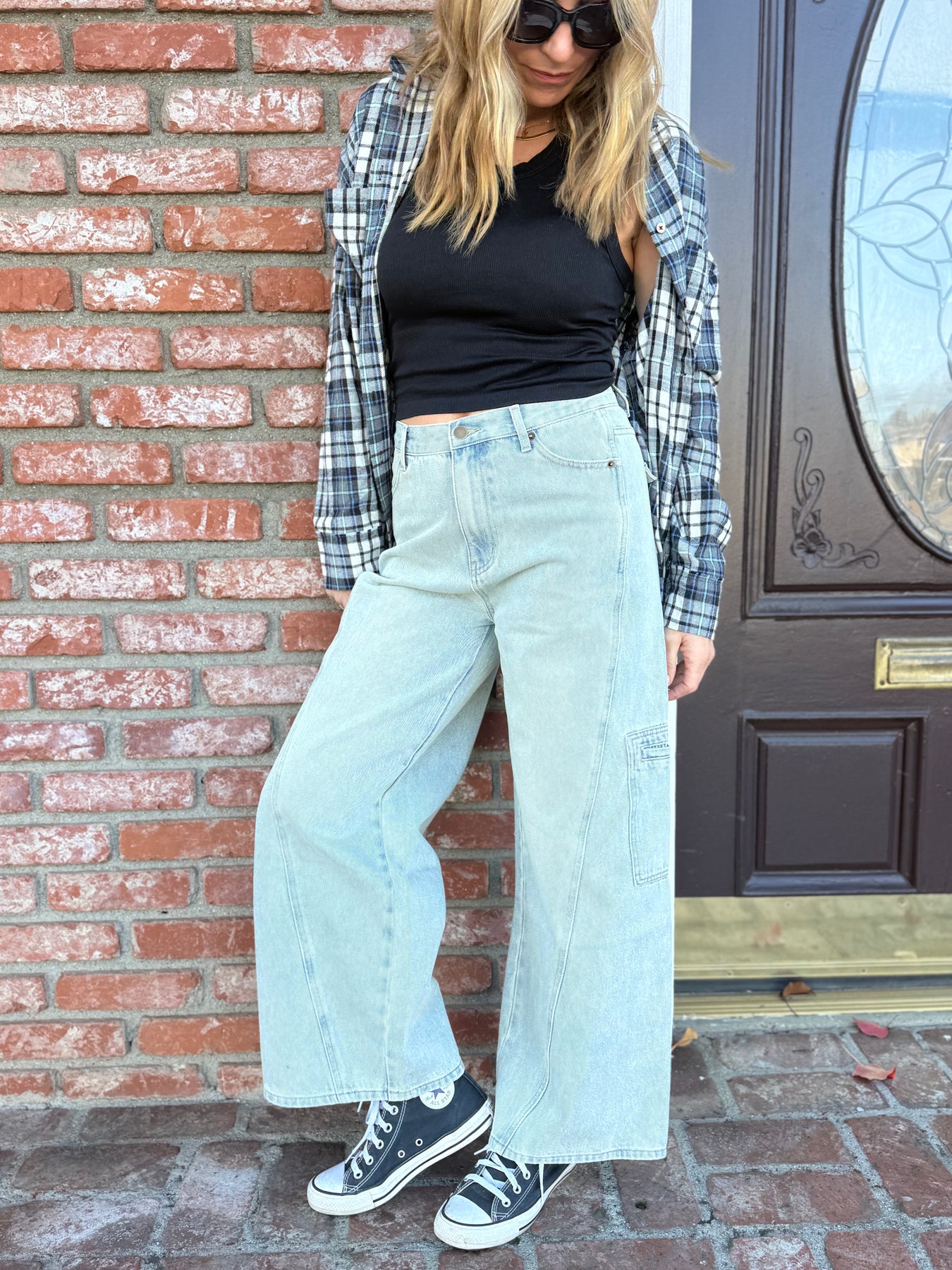 These aren't your average jeans—they're a vibe. The All The Feels Utility Denim Pants combine a flattering high-rise fit with a relaxed wide-leg silhouette that feels effortlessly cool. Features in a vintage wash that looks like you've been styling them forever, they feature practical side cargo pockets and a raw back pocket detail that adds serious character. Perfect for anyone who refuses to choose between comfort and edge.