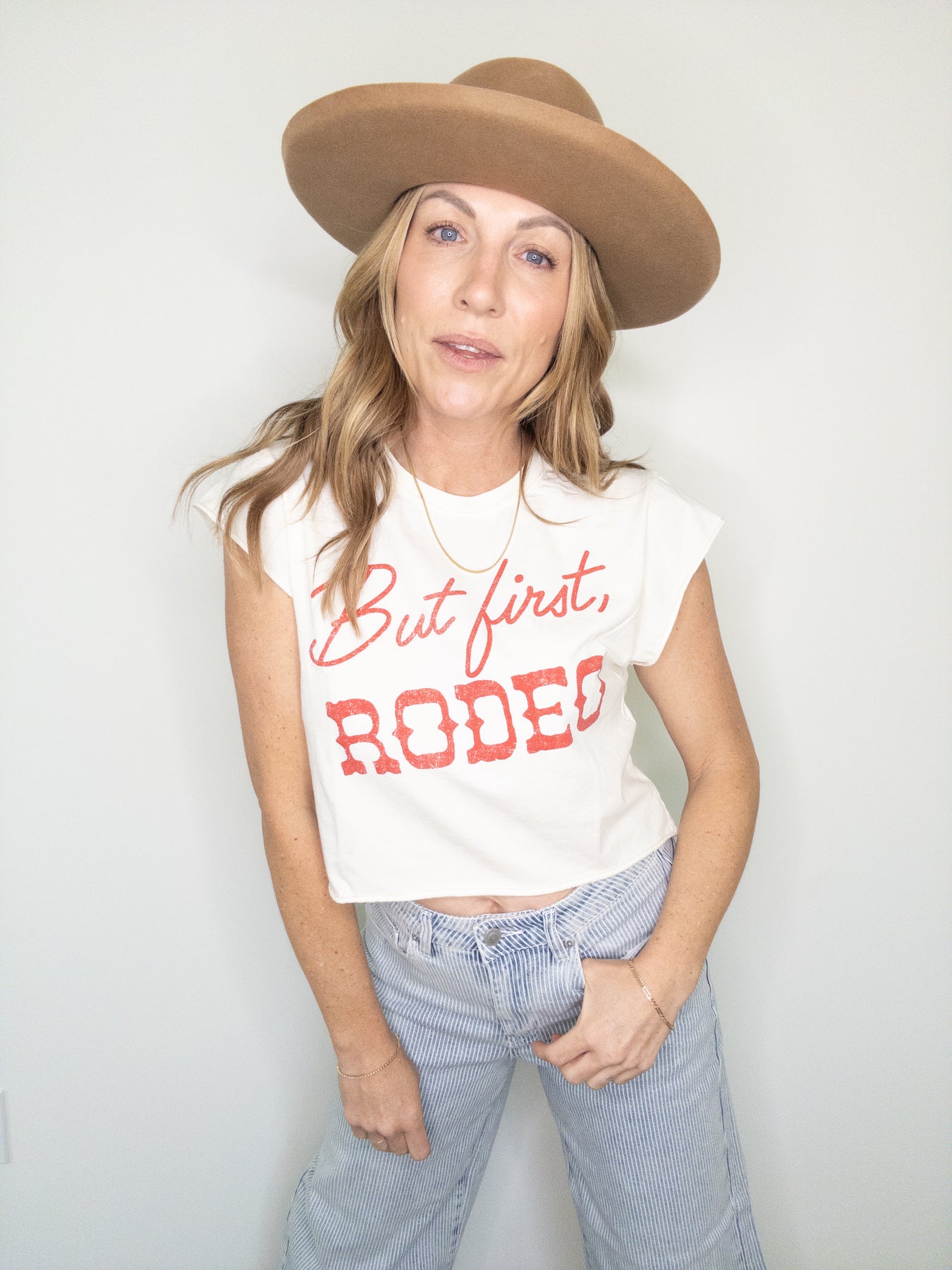 Get ready to rodeo with our quirky "But First, Rodeo" crop top! Made from 100% organic cotton, this stylish and sustainable top features raw edge sleeves and a cropped design. Perfect for any wild west lover, this top proudly shows off your cowgirl spirit. Don't wait, saddle up and add it to your wardrobe today!