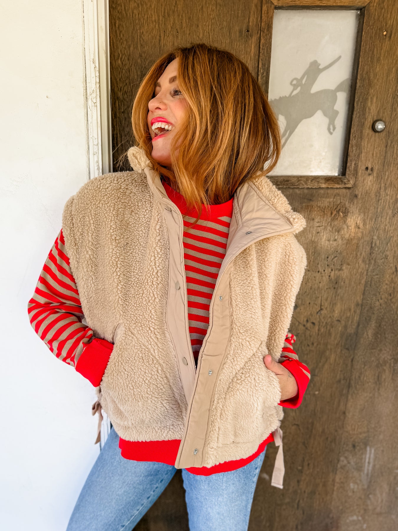 Layer up in effortless style with The Keep It Cozy Sherpa Vest. This soft, plush sherpa vest brings all the warmth without the bulk, featuring a quilted front panel and snap-button closure for that perfectly casual look. Its relaxed fit makes it ideal for layering over flannels, knits, or tees when the temps start to drop. Whether you’re headed out for a fall stroll or just want that cozy-chic vibe, this vest is the perfect finishing touch for your cold-weather outfits.