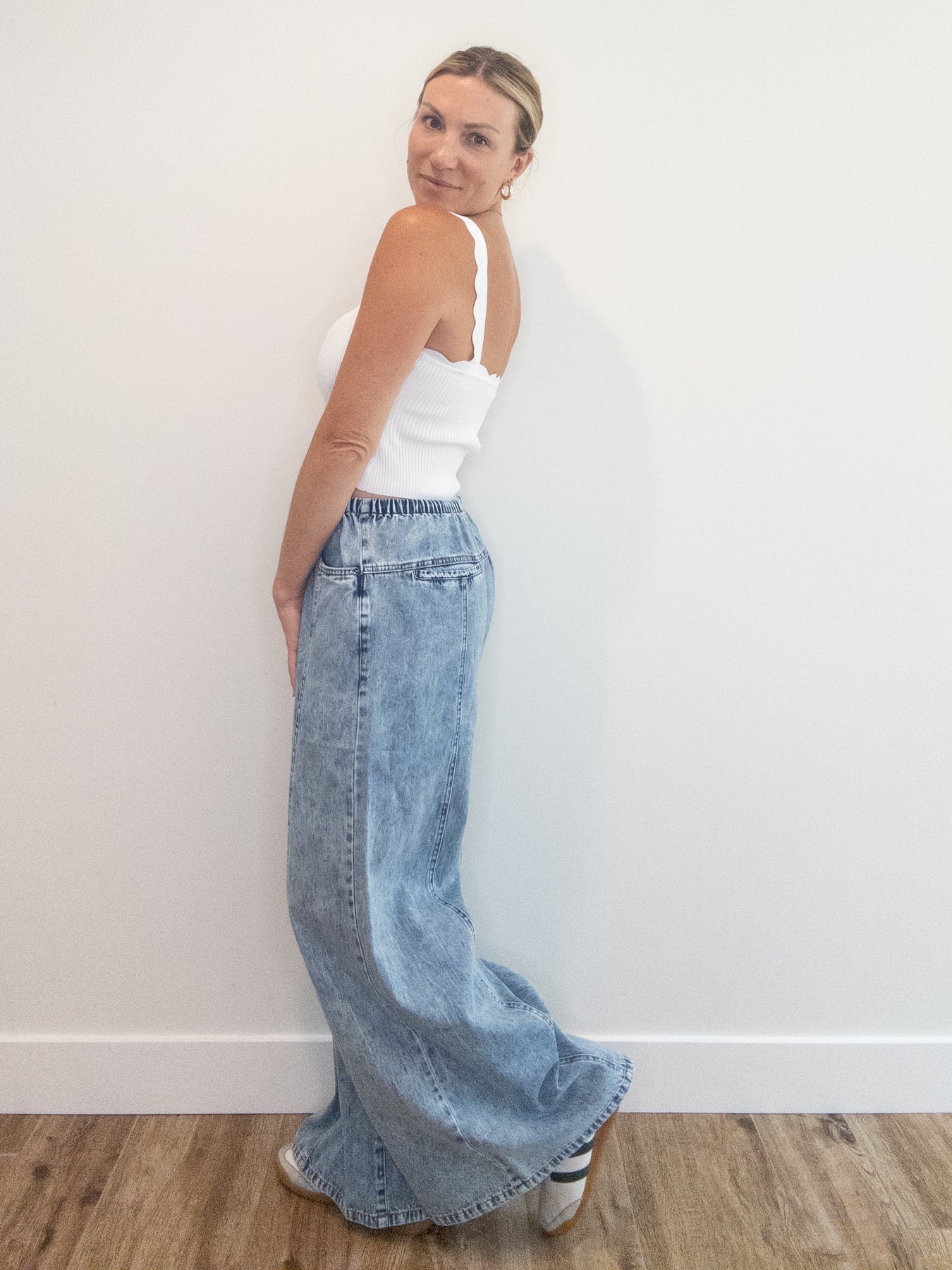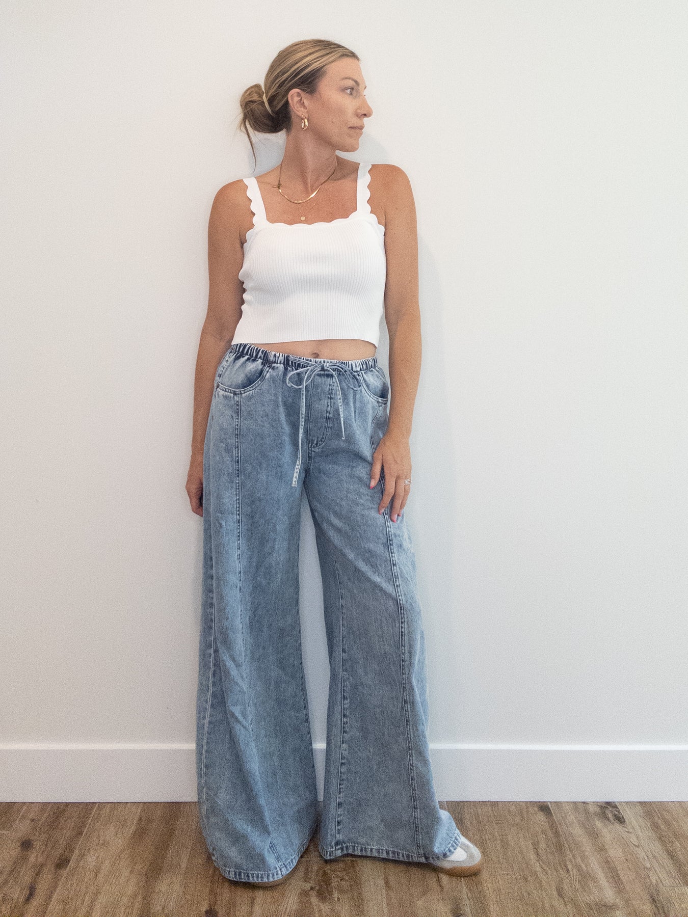 Kick things up a notch with these cool and easy mid rise wide leg pants. Available in a vintage indigo colorway that works all season long, in the summer with a crop tank or paired with a knit long sleeve in the fall. These ultra wide leg pants feature an elasticated waistband with drawstring tie for a customizable fit, functional pockets and subtle seam detailing for throwback vibes we love. Feels like you're wearing your fav sweats but without sacrificing on style!!