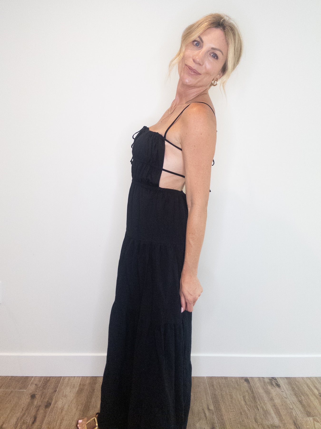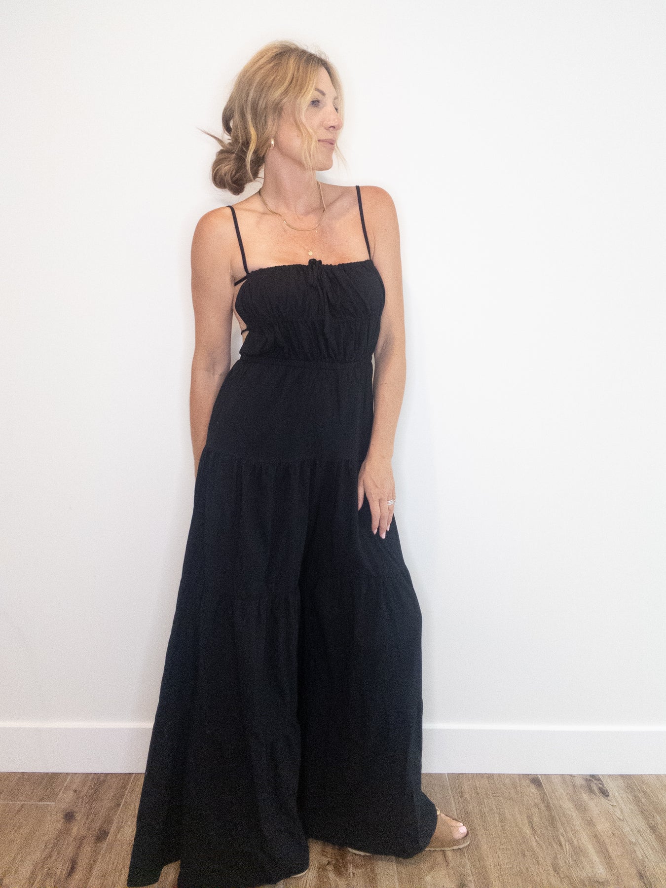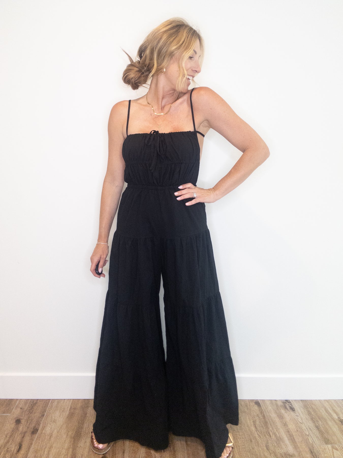 Our new Ramona Jumpsuit is the it girl of the summer. This will become the easiest and most sophisticated outfit in your wardrobe. Features adjustable tie at the center, adjustable spaghetti straps at the shoulder, two ties at the center back and elastic back hem to ensure a flexible fit. The open back and gauzy material will keep you cool both temperature and style wise, while the cinched waist and tiered wide leg cut will give you shape. The black tone will pair with any accessories you choose to wear it with making it the perfect piece to dress up and down! Lined.