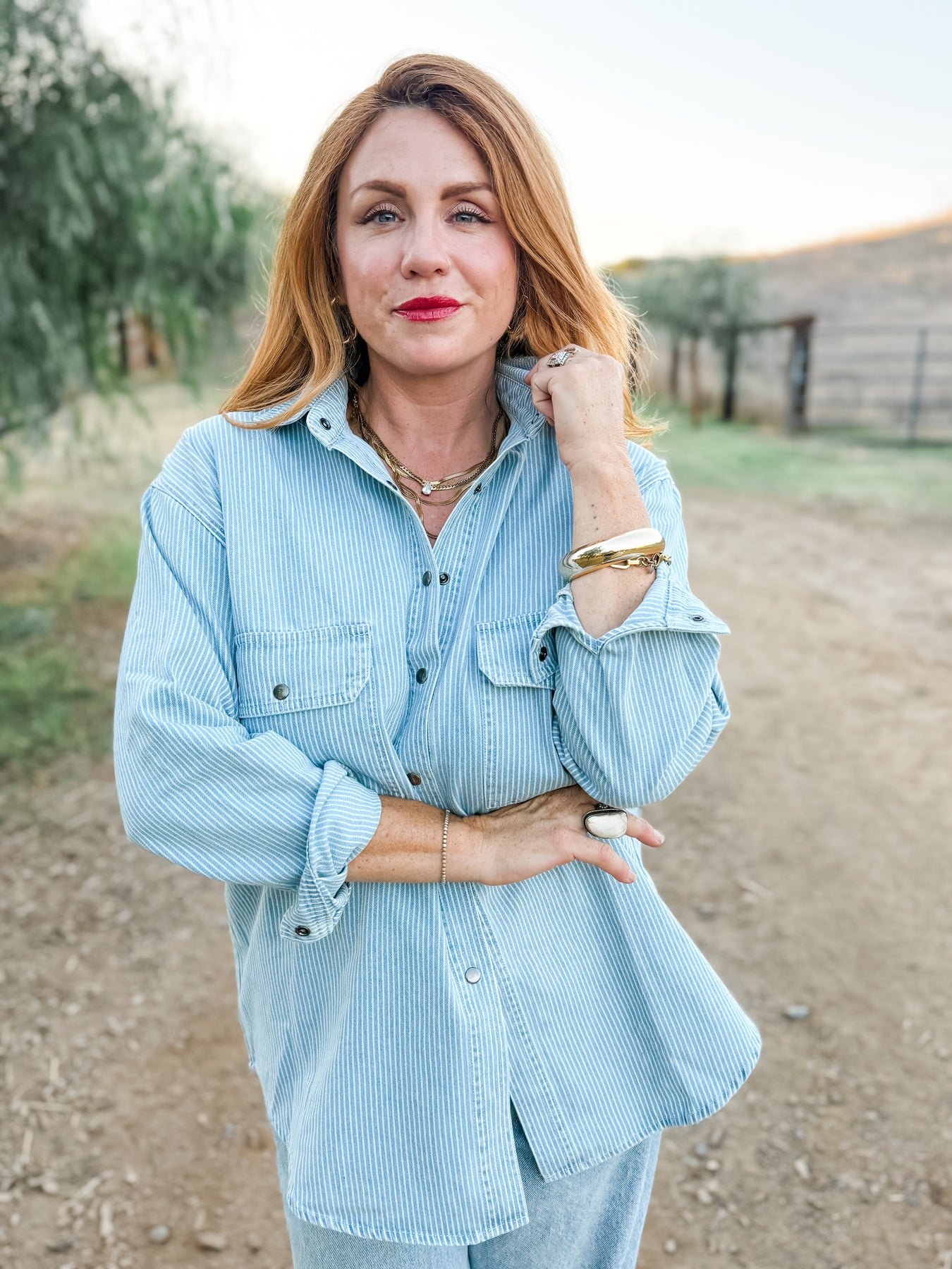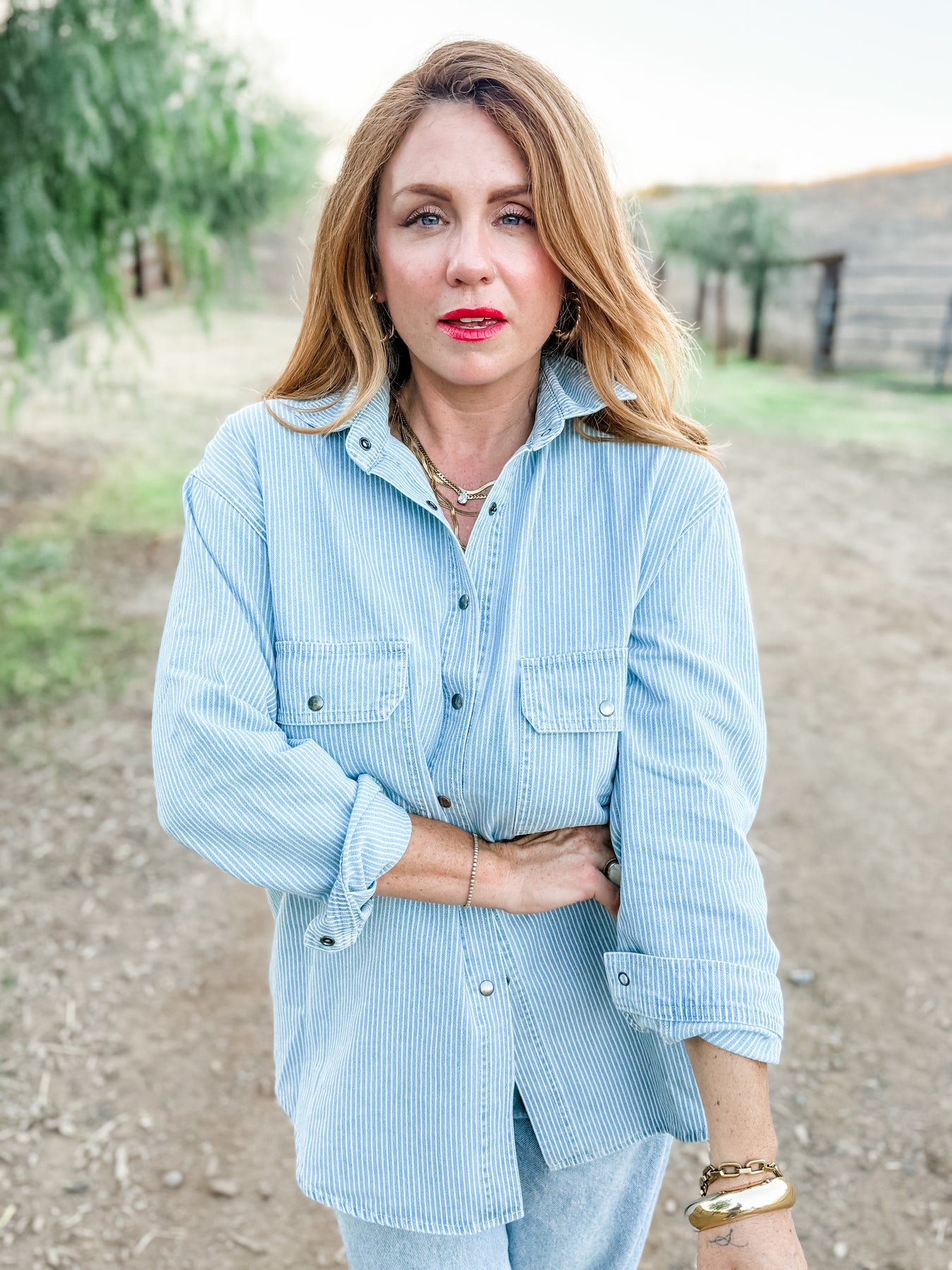 Soft and ultra comfortable, the Weston Pinstripe Shirt is sure to become an everyday part of your wardrobe. This non-stretch denim button up is relaxed jacket featuring flat metal button details, a collared design, large front pockets, and a straight hem for an oversized fit. An easy piece to layer over any look, in a white pinstripe denim, this piece is perfect for the season.