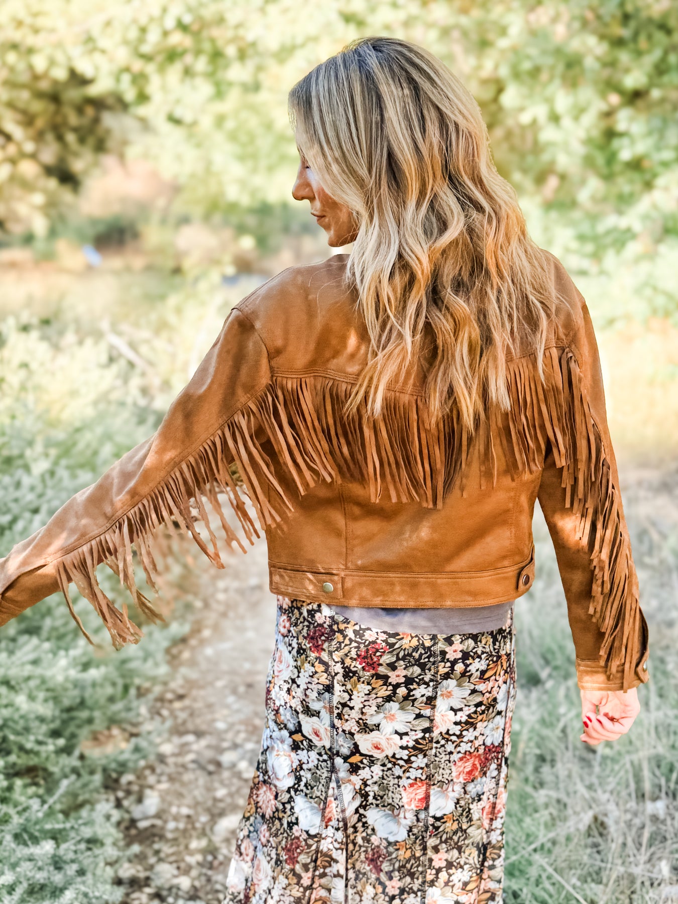 Stay wild and free in this fabulous suede fringe jacket! A statement piece you don't want to miss out on. It's a fun jacket to wear all year round and pairs easily with so much: cutoffs and a graphic in the summer or with a midi dress and booties in the fall. A semi-cropped length with fringe back that extends down the sleeves. Featuring zipper front, side pockets and snap button details. Live your best life in this fun fringe jacket!