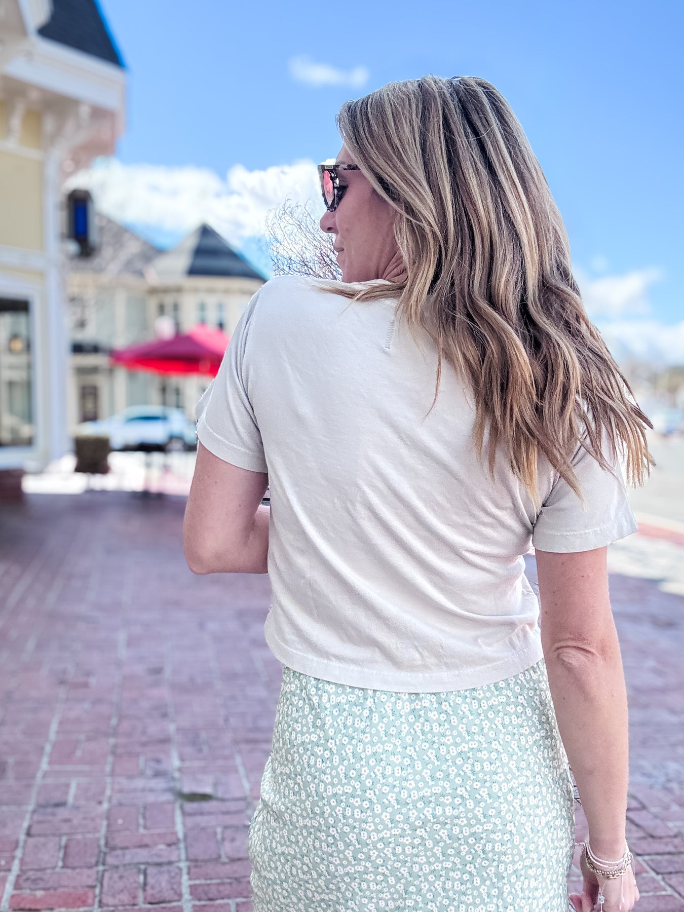 Length - Slightly cropped. Hits at the top of a high rise denim.