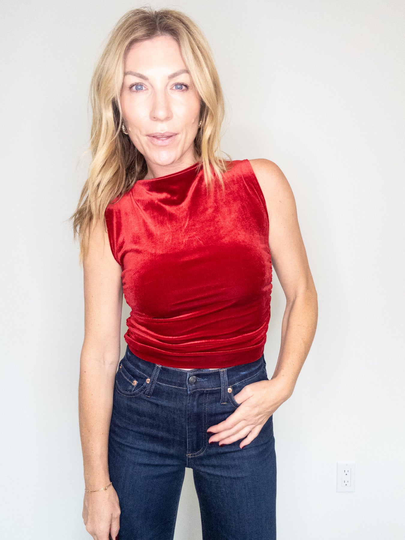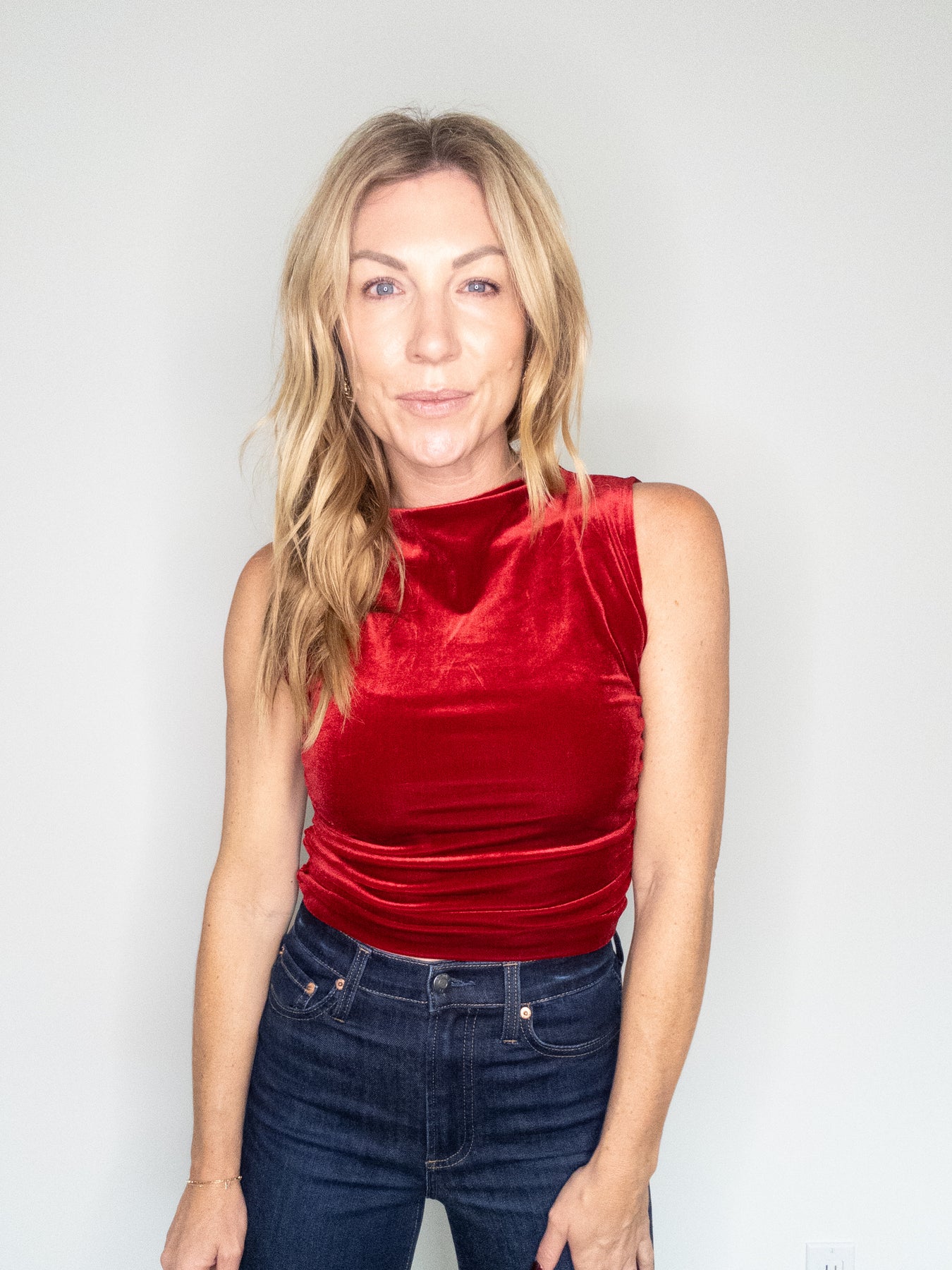 Step up your evening game. The On Repeat Tank features soft velvet and a fun mock neck for a standout look. With playful side ruching, this red tank adds a pop of flair to your outfit. Pair it with a sleek skirt, casual jeans, or tailored trousers, and get ready to turn heads on your next night out.