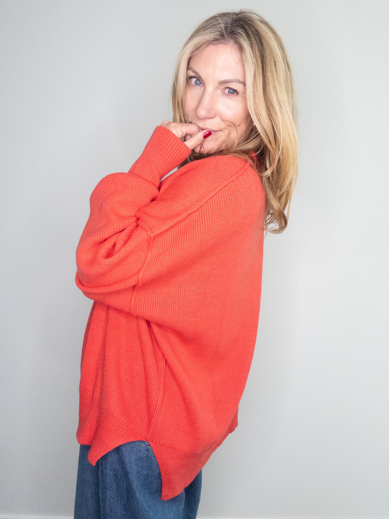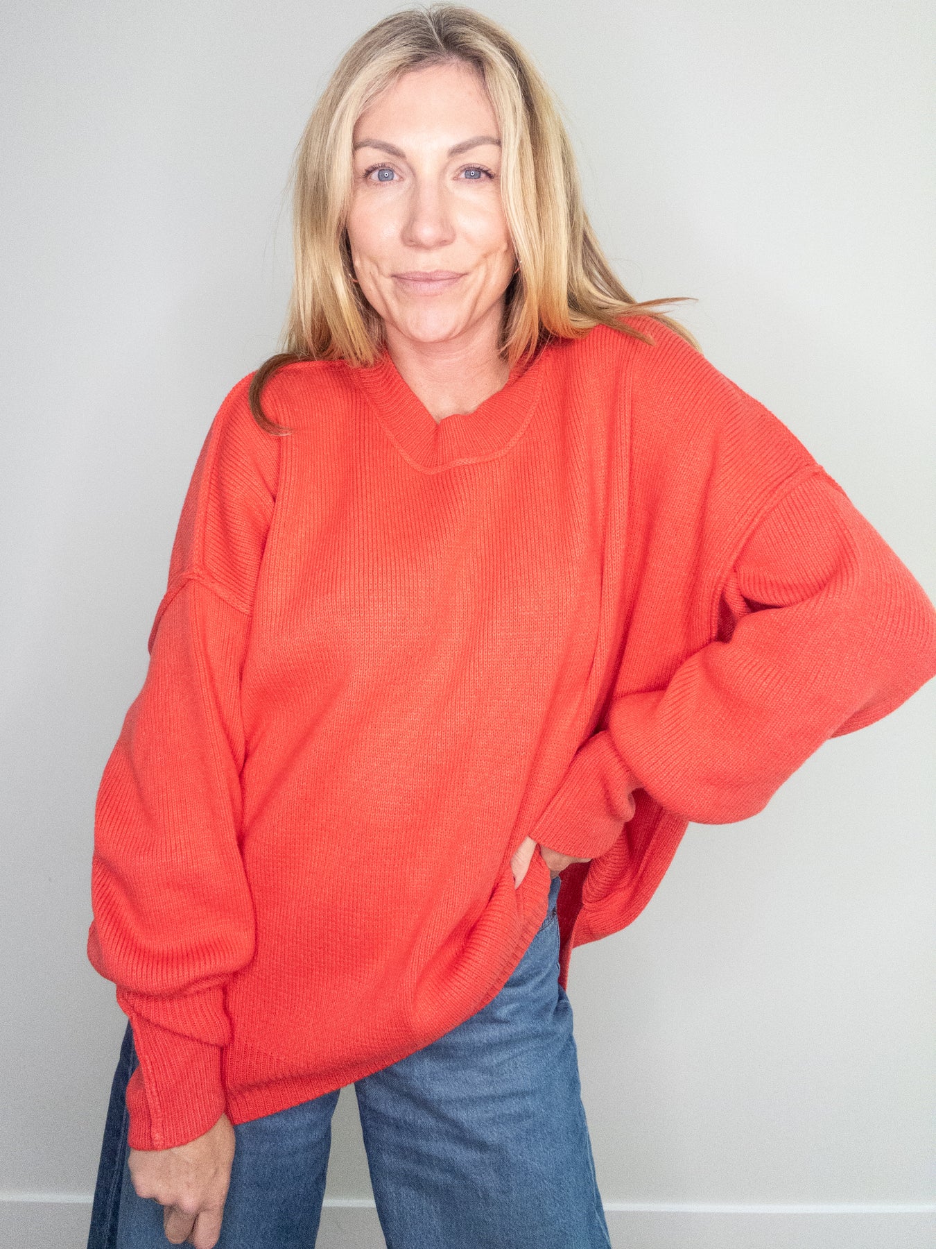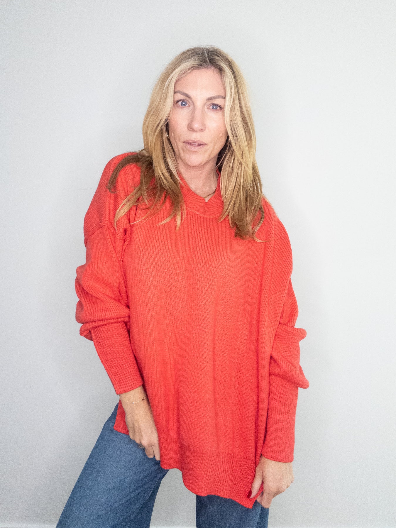 The perfect combination of cozy and chic, the Cherry Pop Oversized Knit Sweater is a heavier weight sweater with a yummy feel and oversized fit. A ribbed crewneck sweater with side slit hems, drop shoulders and exposed hem detailing. This sweater is finished off with ribbed trimmed neck, sleeves and hem. Easy to toss on and pair with jeans, a slip skirt or worn over a slip dress.