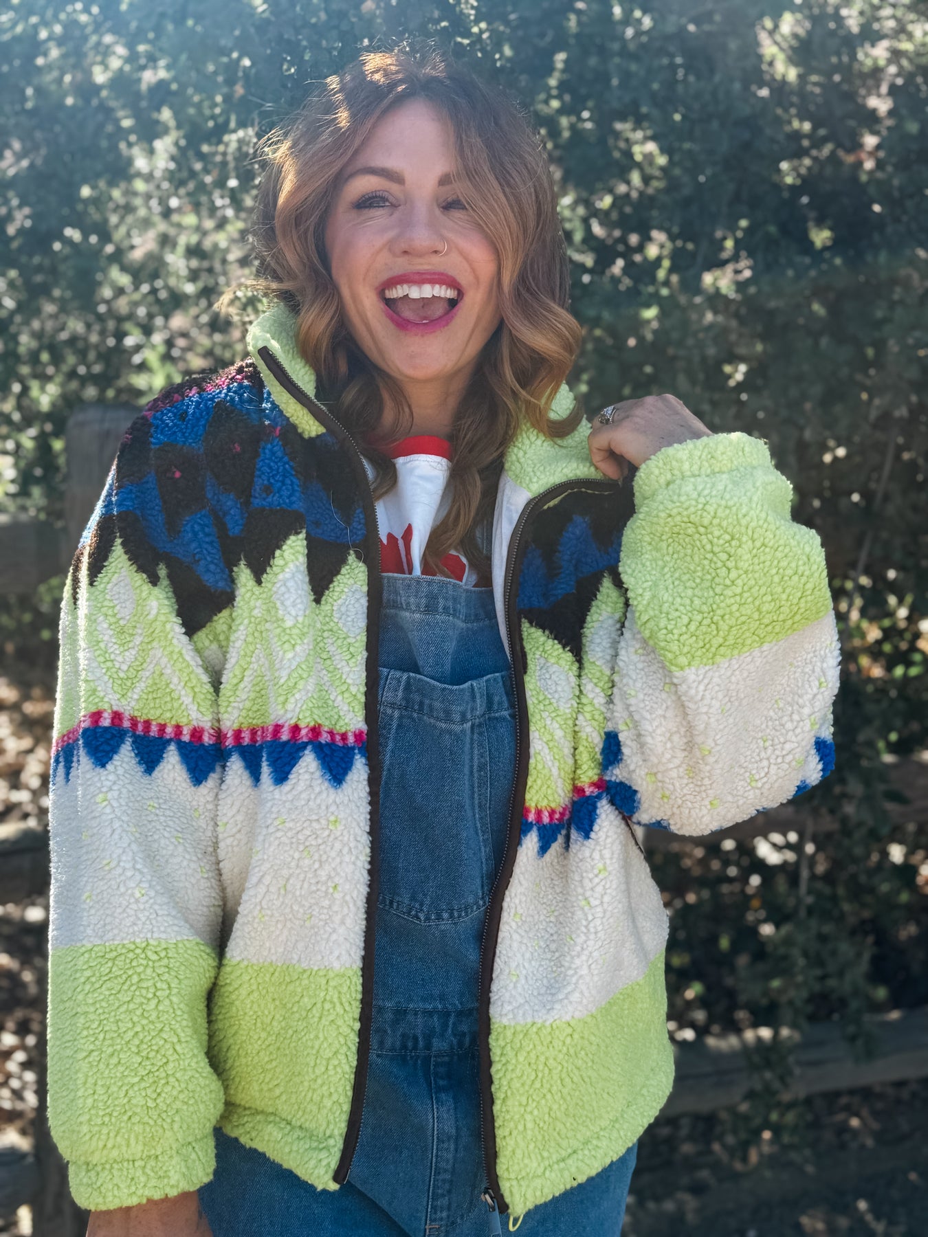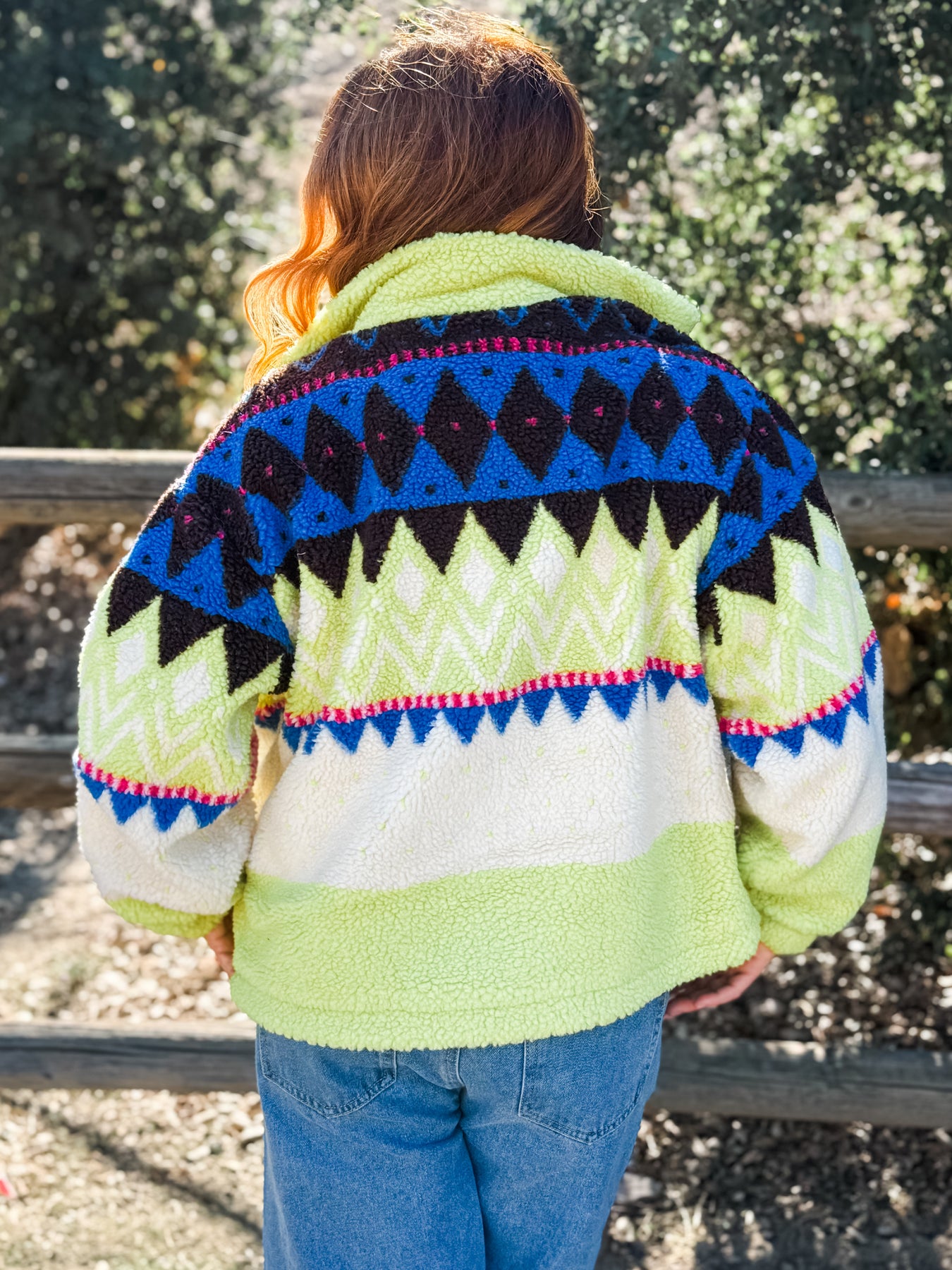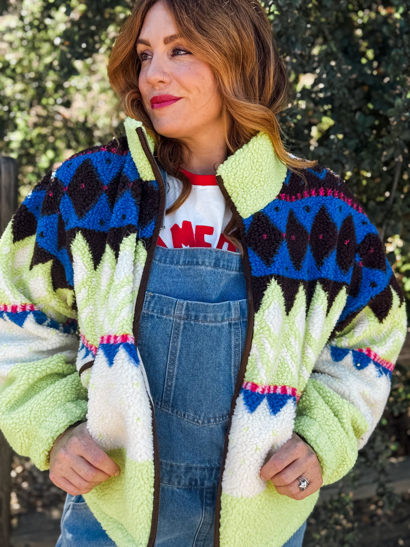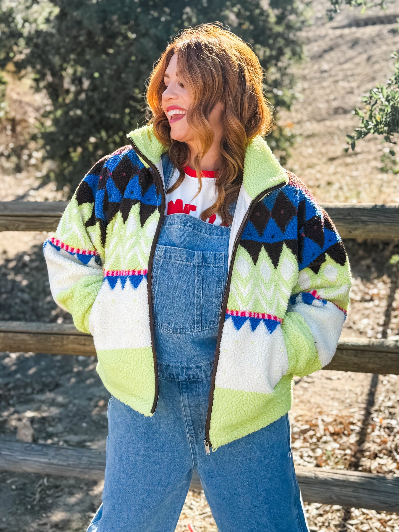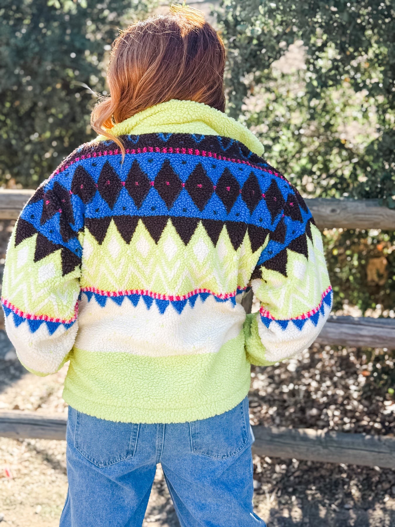 The Colorado mountains are calling with this 70's inspired sherpa jacket! The Whistler Sherpa Jacket features and yellow color palette full of unique patterns that remind you of a cozy ski lodge in the mountains! High neck, elastic waist, and front pockets, this piece will keep you warm all winter long!