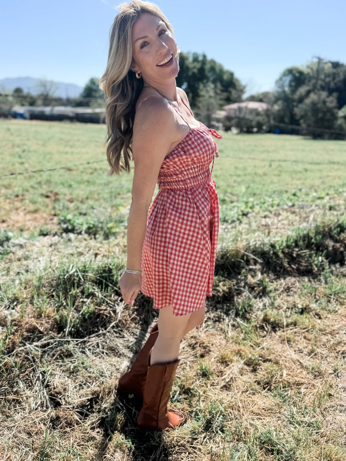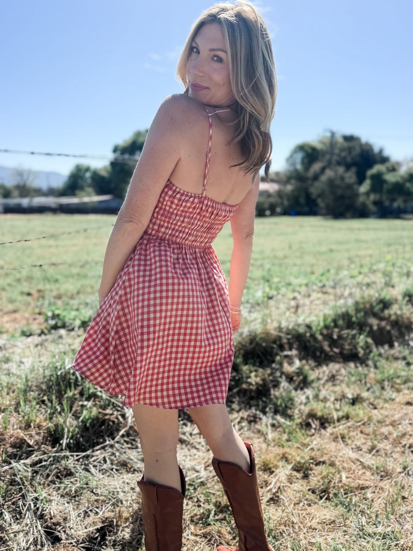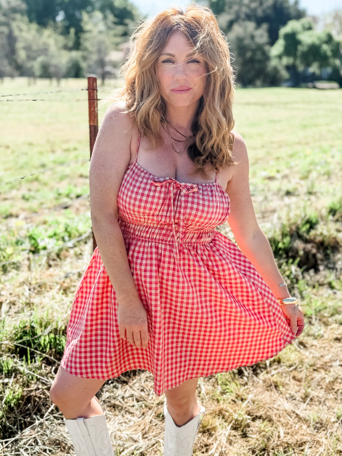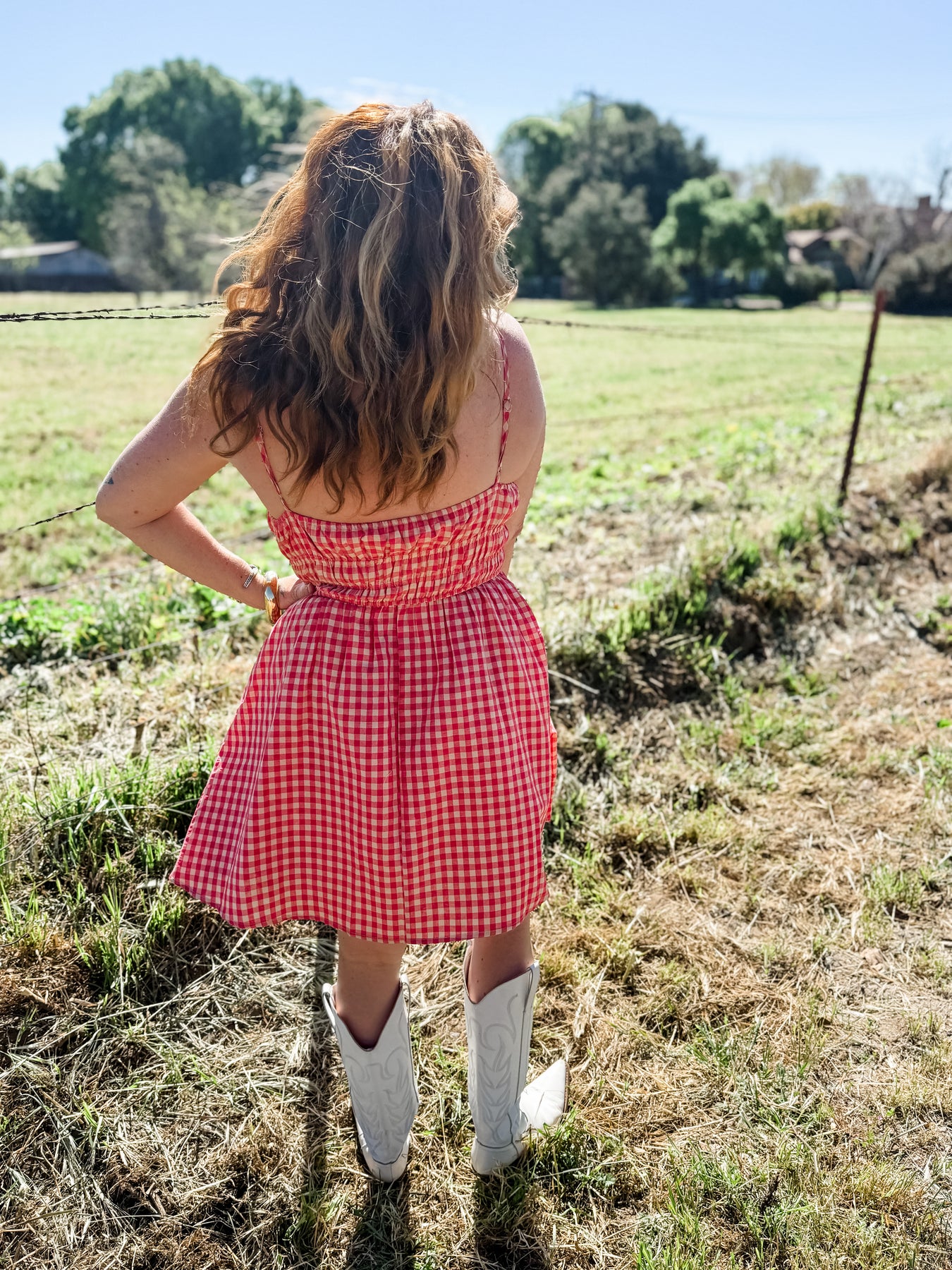 Why we LOVE it: The Cherry Basket Shirred Mini Dress is a muted mini dress with a fun gingham print in a red and ivory color way. Featuring adjustable straps, cinching bust detailing and a front tie, this is a perfect dress for summer. She is versatile and can be styled for brunch or paired with boots for a country vibe. We love the way she fits into any closet.