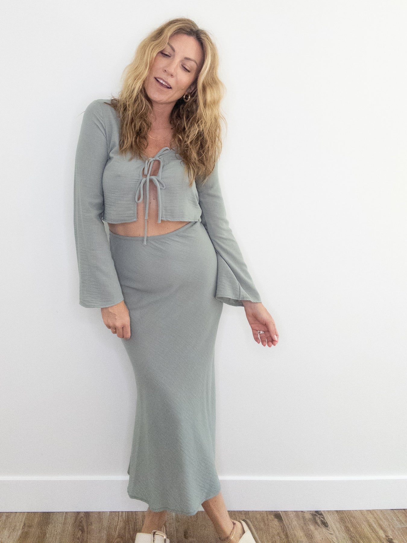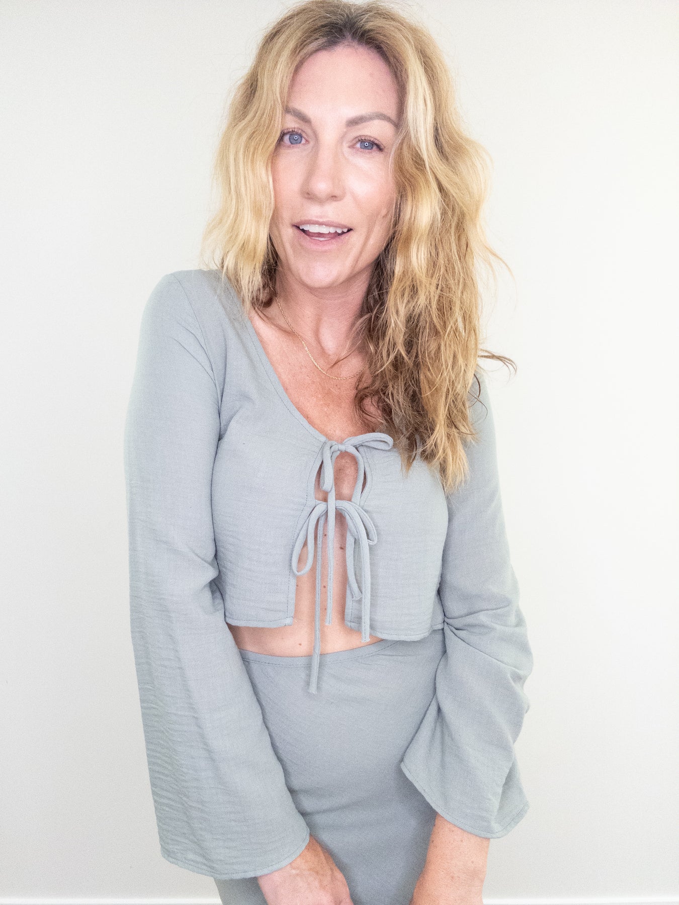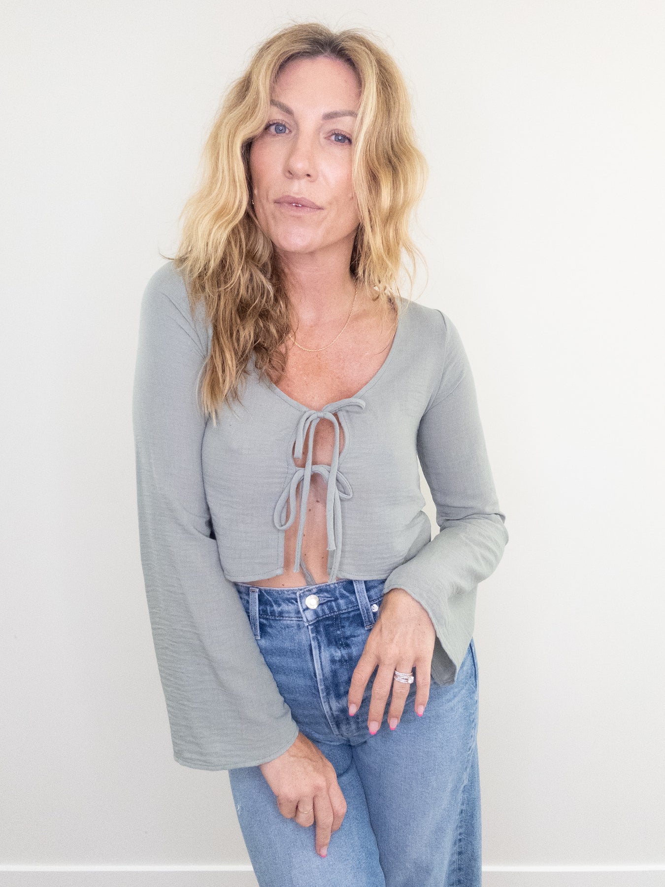 Crafted with a tie front detail and olive linen blend fabrication, the Earth Sign Tie Top adds a little extra flare we love. A slightly cropped fit with loose sleeves and square neckline, this top can be worn on its own or layered over a bralette or tank. With a flirty silhouette this top is finished with a double tie front closure and slight flare sleeve. Wear with your favorite jeans or pair with the matching Earth Sign Midi Skirt to complete the set.