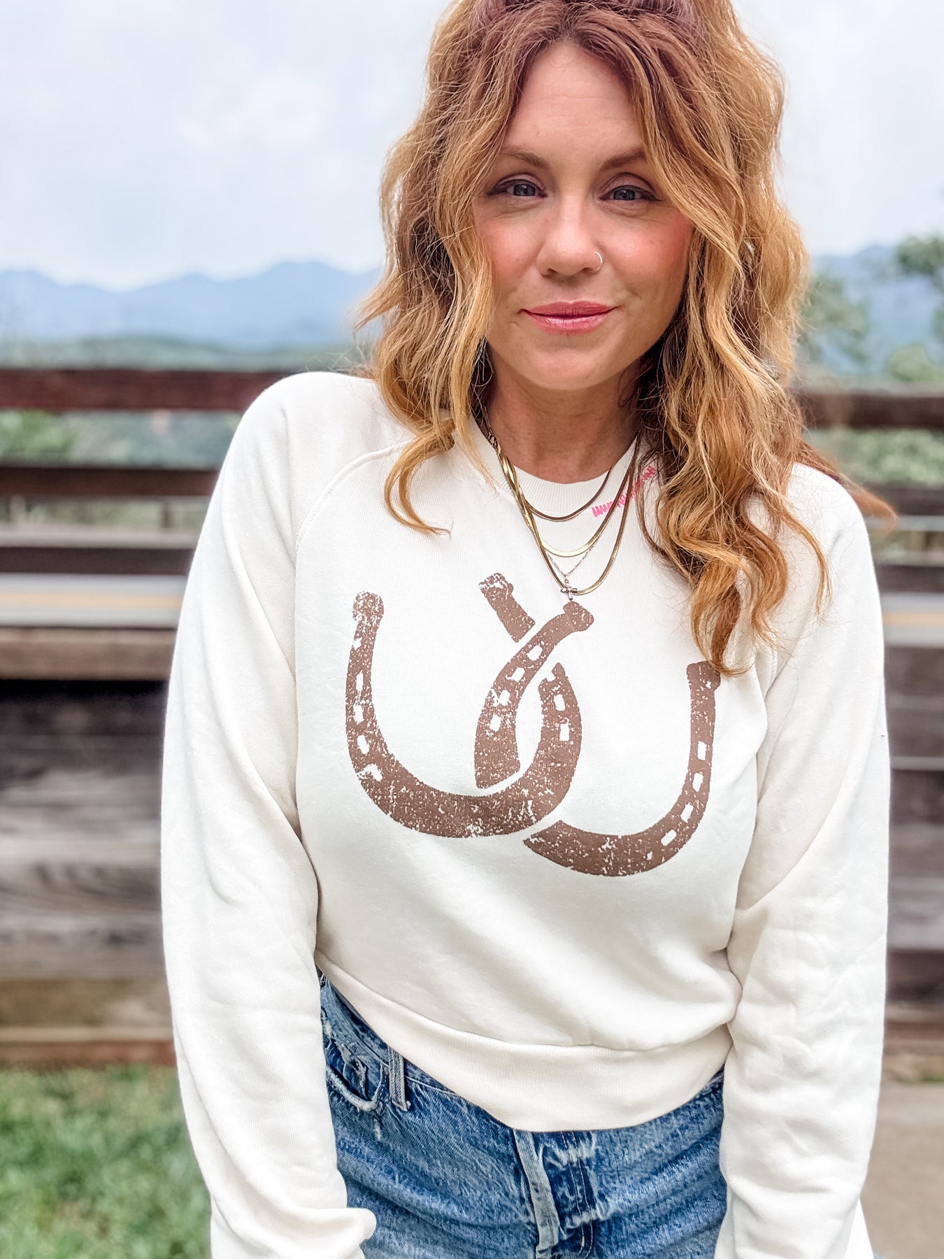 Why we LOVE it: The Double Horseshoe Shrunken Sweatshirt brings a playful wild west to your everyday life. Designed in soft brushed fleece with a slightly shrunken fit, it features a bold vintage-inspired horseshoe graphic and an embroidered pink collar detail for a polished finish. Easy to throw on and saddle up!