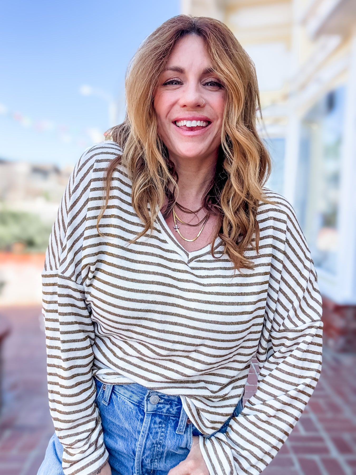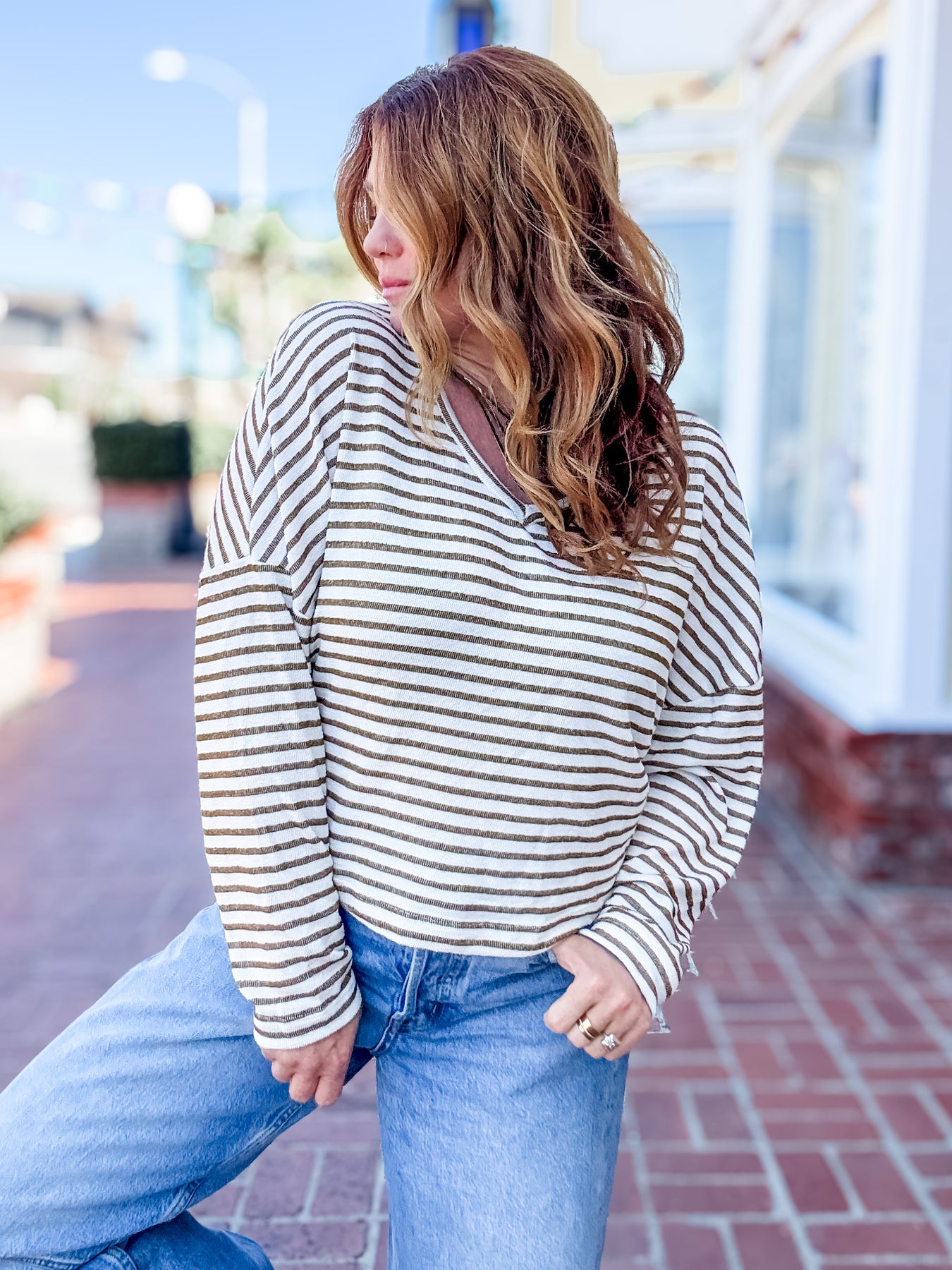 Why We Love It: Let's hear it for lightweight long sleeves. The Ren Textured Relaxed V-Neck Long Sleeve features our signature textured fabric that you all know and love. The soft v-neckline, drop shoulders, and overall draped fit create a casual, effortless staple. Pair with jeans, heels, and a cute bralette underneath for mid-week happy hour.