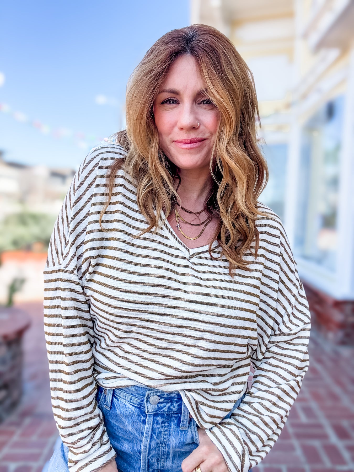 Length - standard top length. Could wear untucked and casual with a boxier silhouette or tuck in for an effortless, easy vibe that adds a bit more structure.