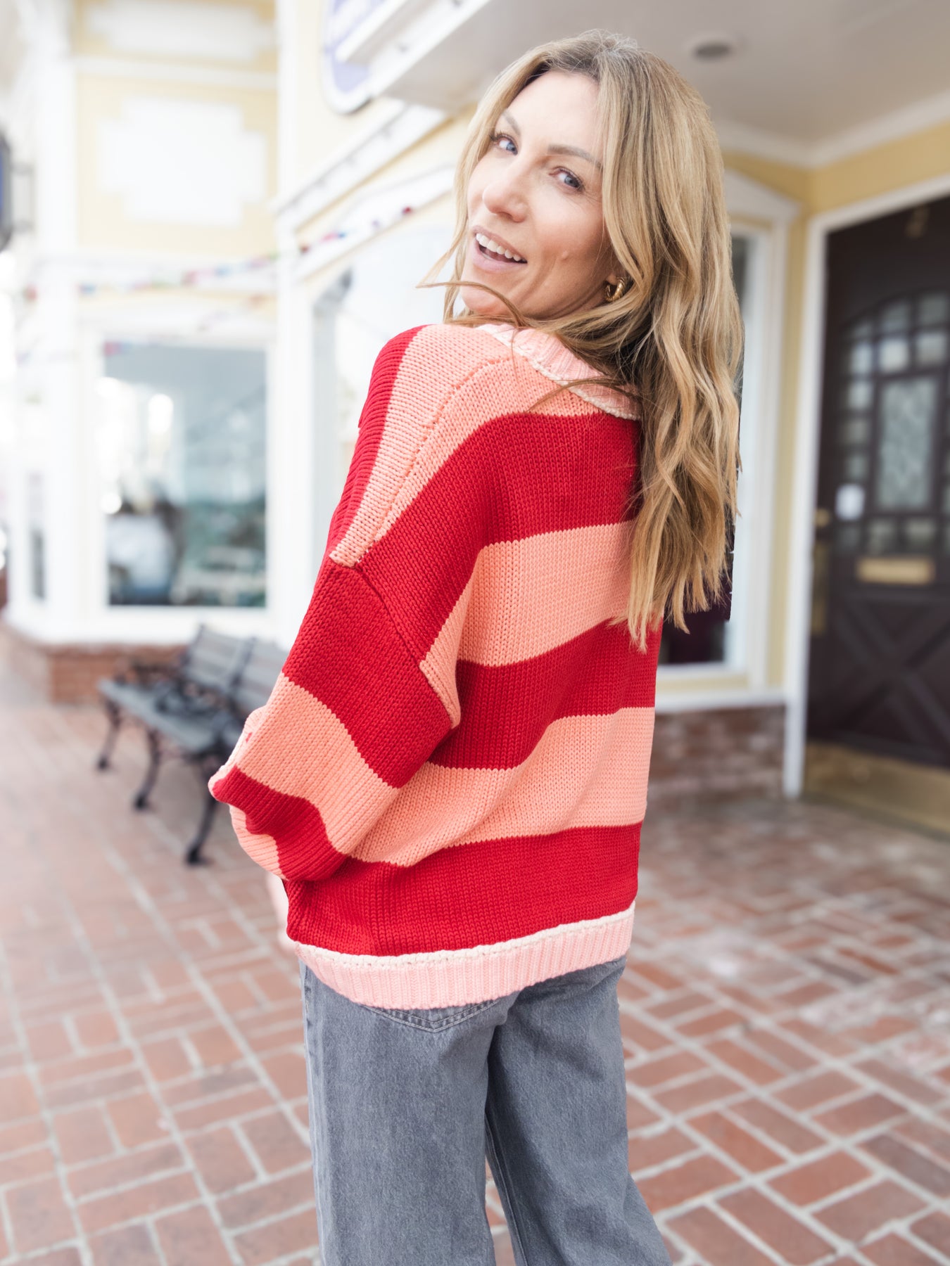 Why we LOVE itCozy meets effortlessly chic in this red. and pink striped knit sweater. Designed with a relaxed, oversized fit, it features classic horizontal stripes, a loose crew neckline, and bubble style sleeves for a slouchy drape. The midweight knit makes it perfect for year-round layering—pair it with denim for an easy everyday look