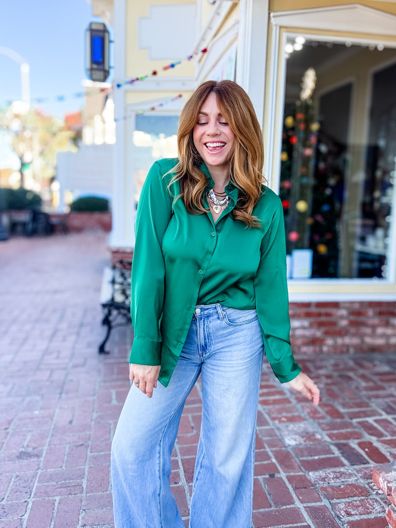 Looking for the perfect button down, collared white shirt to add to your closet?  This is a must have.  A stylish spin on a classic.  She has a slightly oversized slouchy fit with a fun hidden button detail down the front. Buttons on the sleeves and a drop back.  Add it under a jacket or wear it on it's own to elevate your fit!