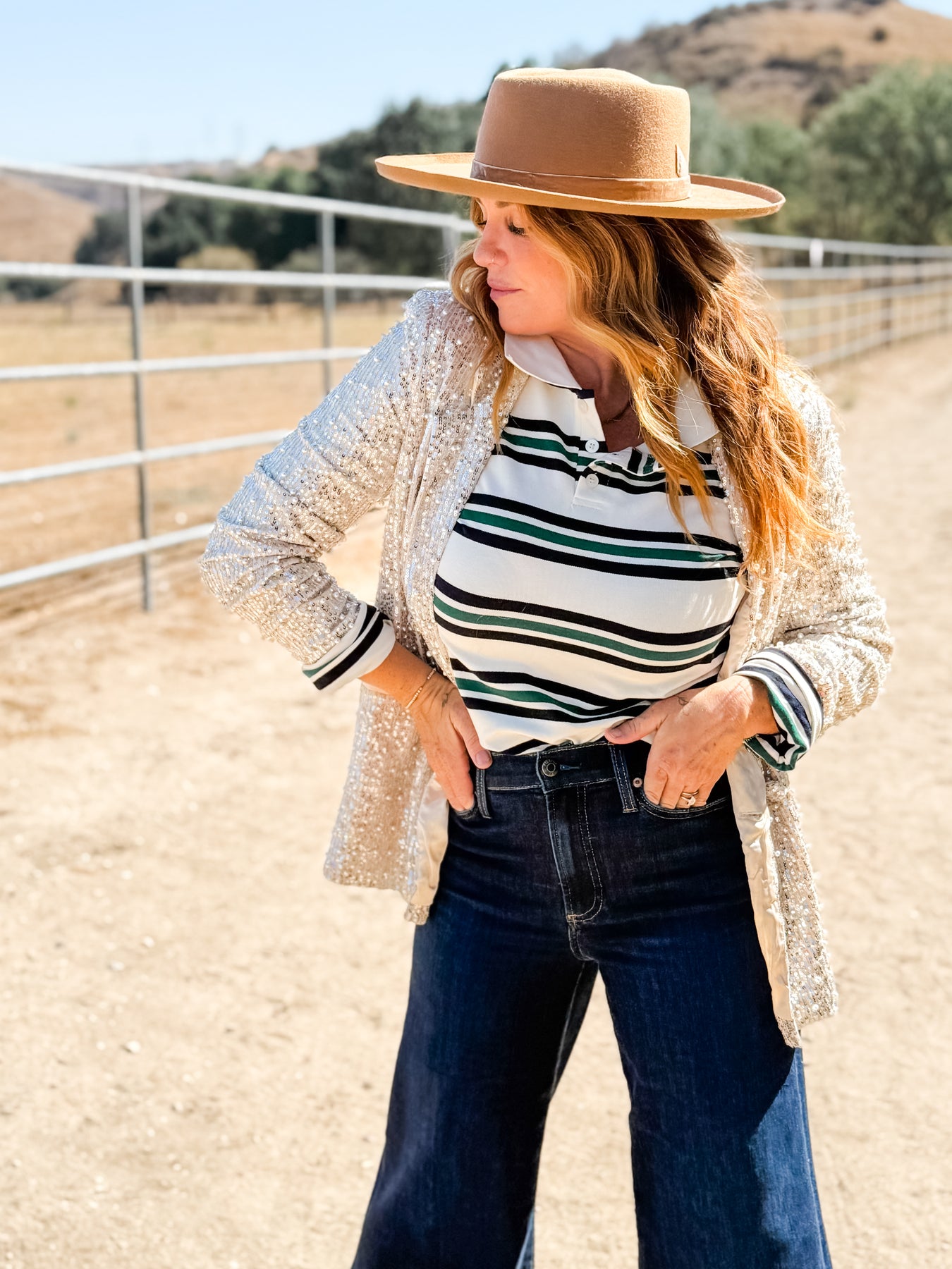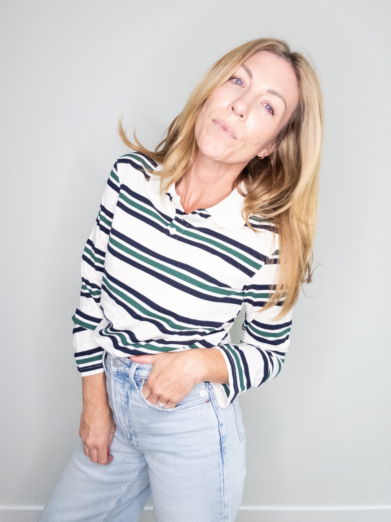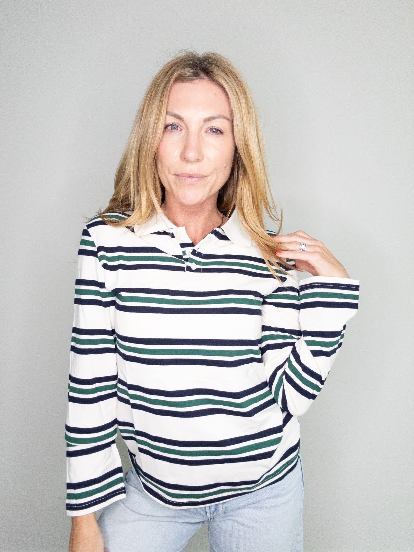 The Newport Stripe Polo features a refined striped pattern on a comfortable, long-sleeve design, ideal for layering or standing out on its own. With navy blue and forest green striping on an ivory collared silhouette, this rugby style polo is on trend for the season. Perfect for those seeking a polished yet relaxed look, paired with your favorite denim and go to sneakers.