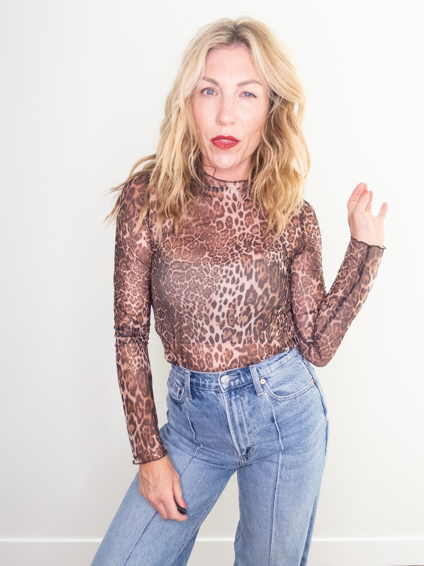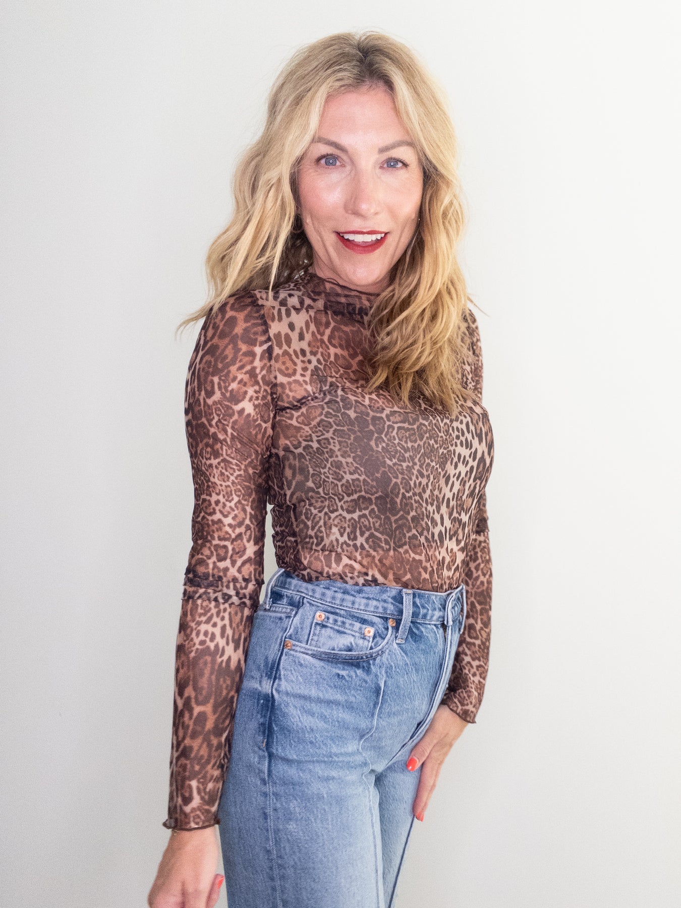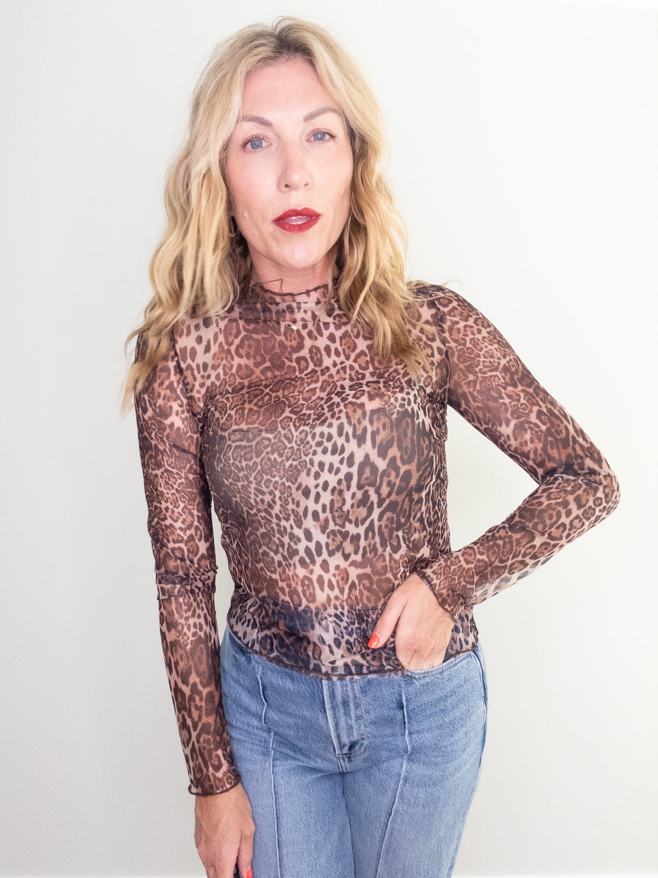 The Wild Night Long Sleeve is fresh in store and won't last long! This leopard print mesh top is a spicy number perfect for your night out. Featuring high mock neck and exposed seams, this top is finished with slight lettuce trim throughout the hemlines. A loose straight silhouette that will move with you. A must have layer, whether underneath your favorite cardigan, band tee or over a cami.