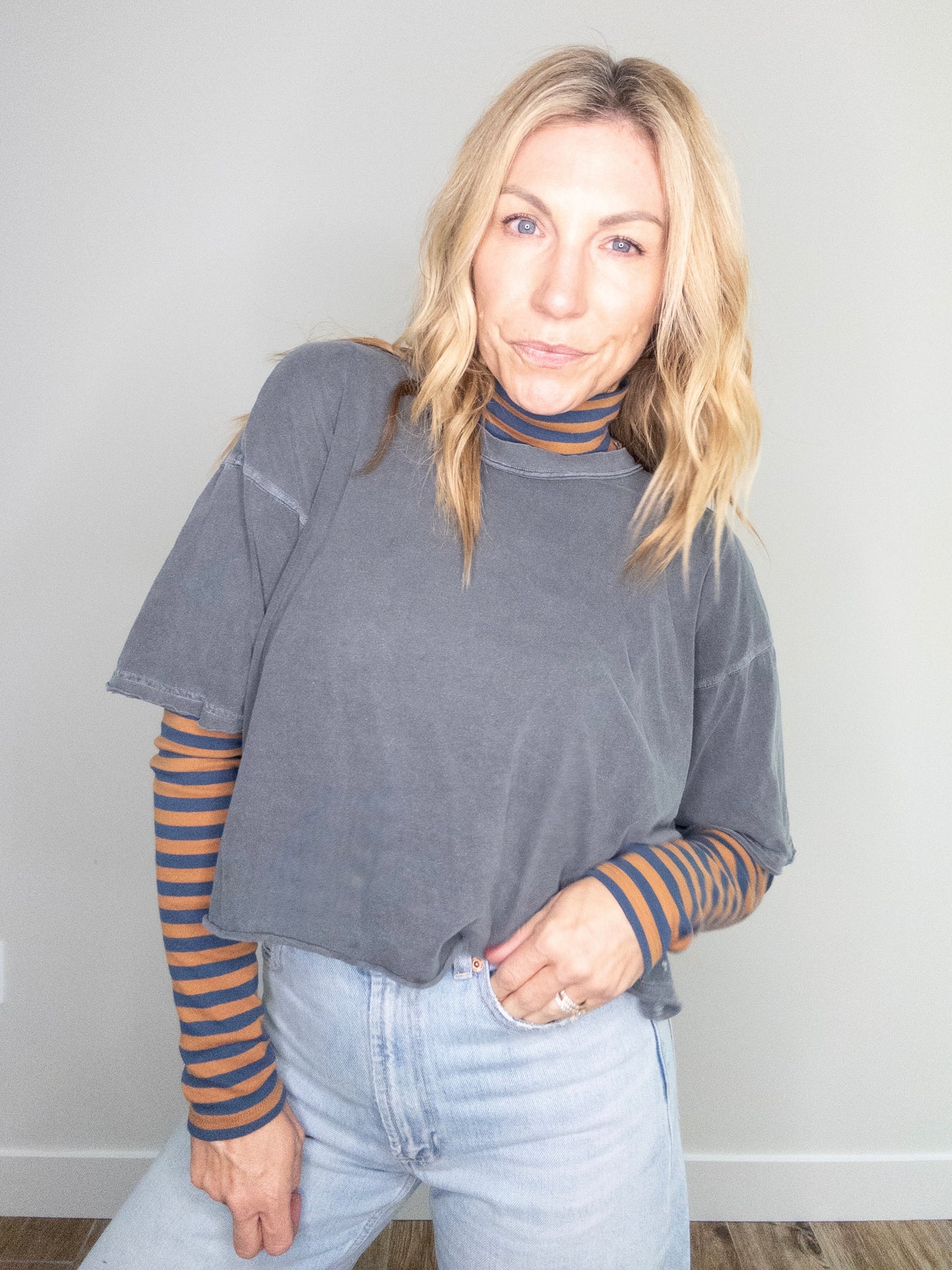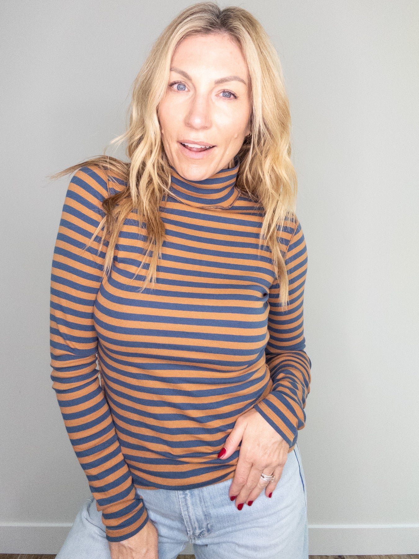 A chic striped turtleneck trending this season, The Parallel Lines Striped Turtleneck is a must have. In a teal and brown stripe with exposed seam detailing, this versatile long sleeve can lean into any look. Crafted from a soft stretchy cotton blend that is lightweight and comfortable, with a body hugging fit making it perfect for layering. As temperatures drop we love it under a graphic tee, overalls or a dress making it the statement piece you didn't know you were missing.