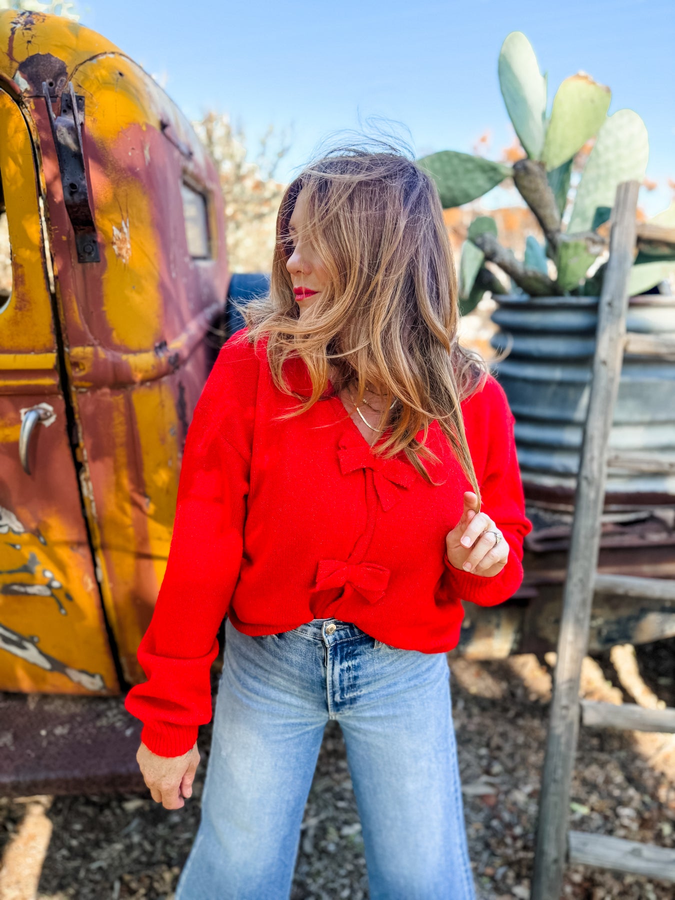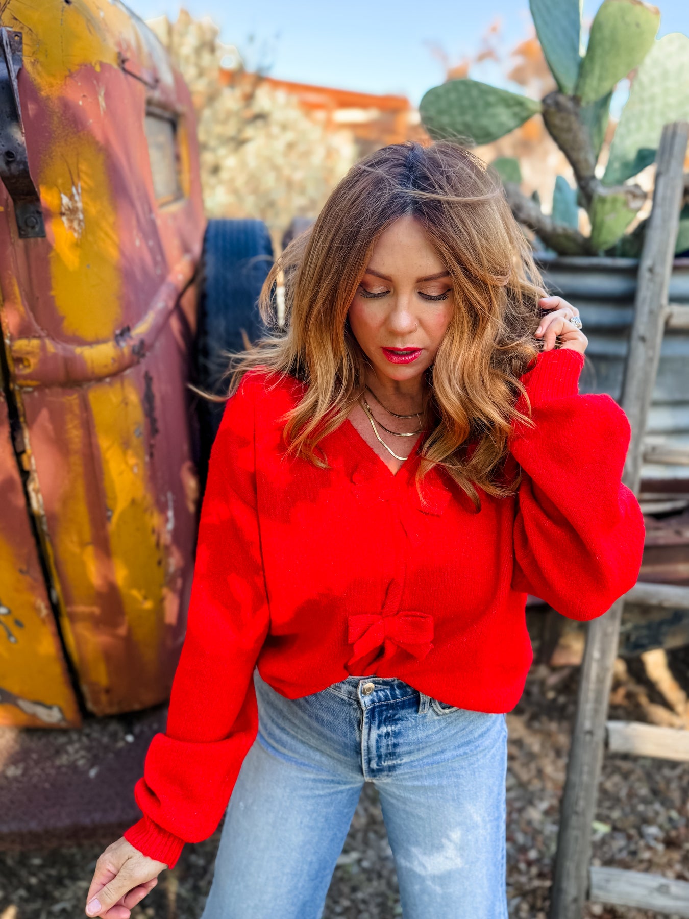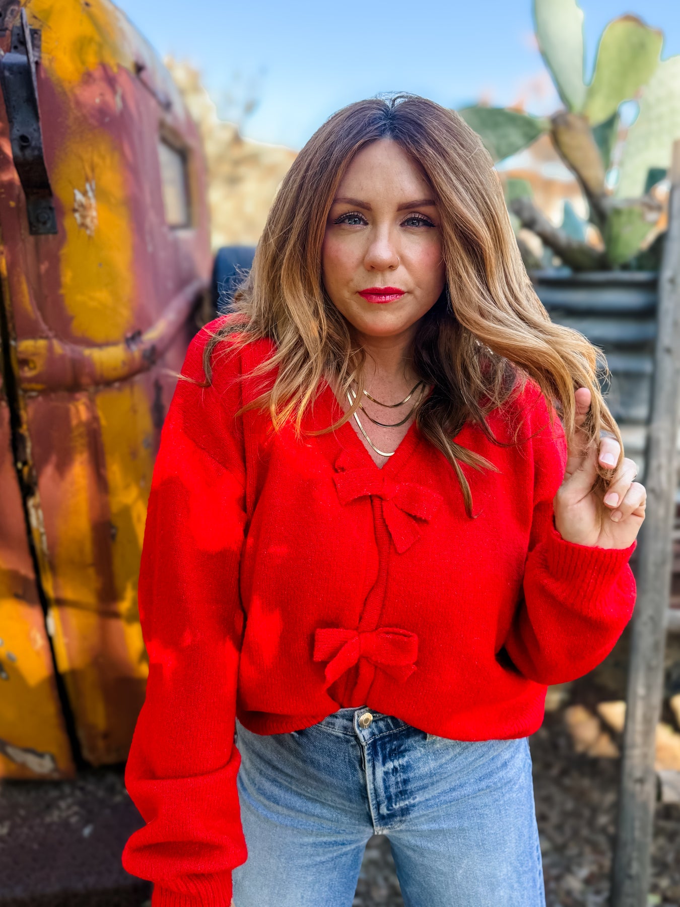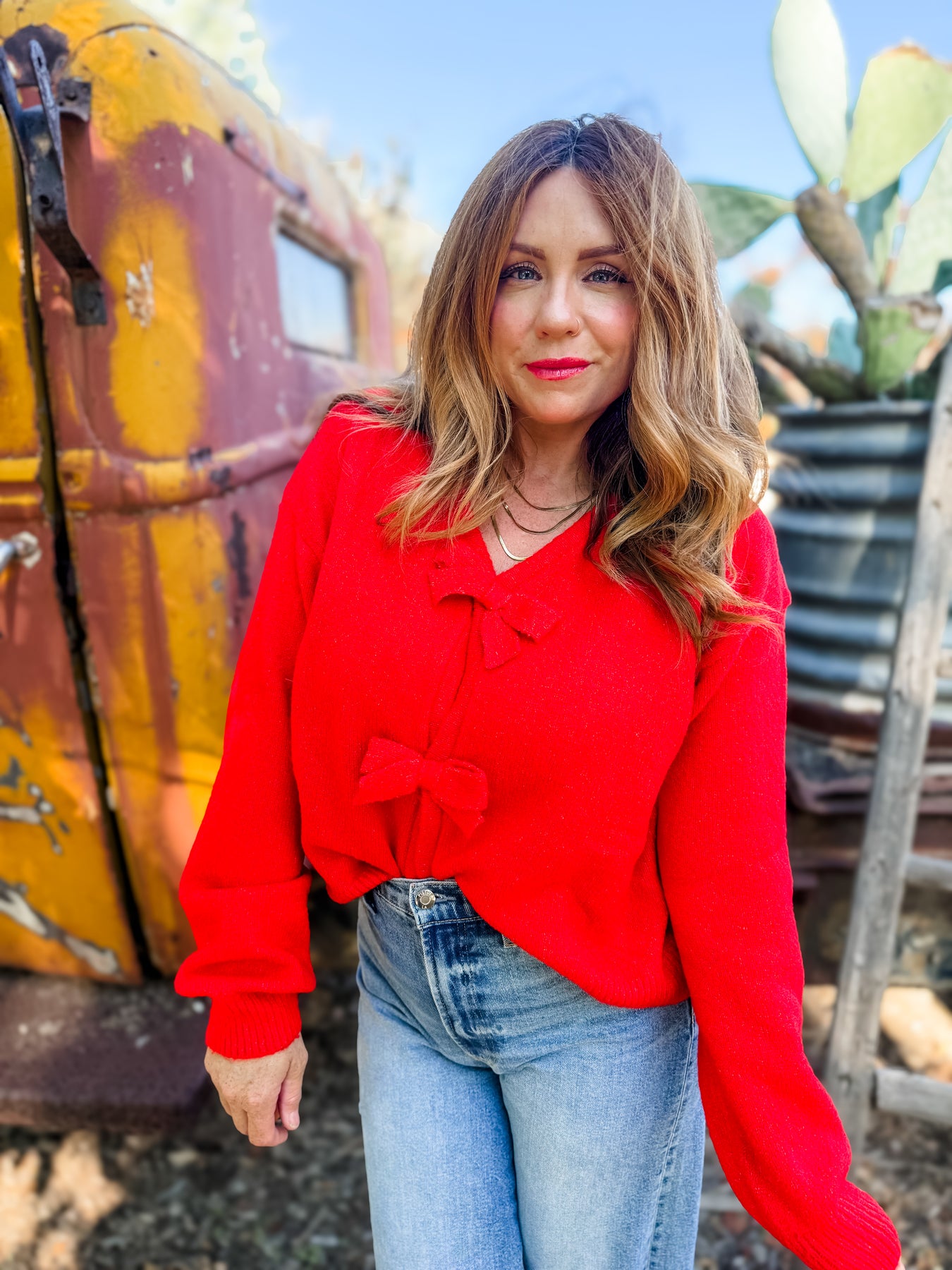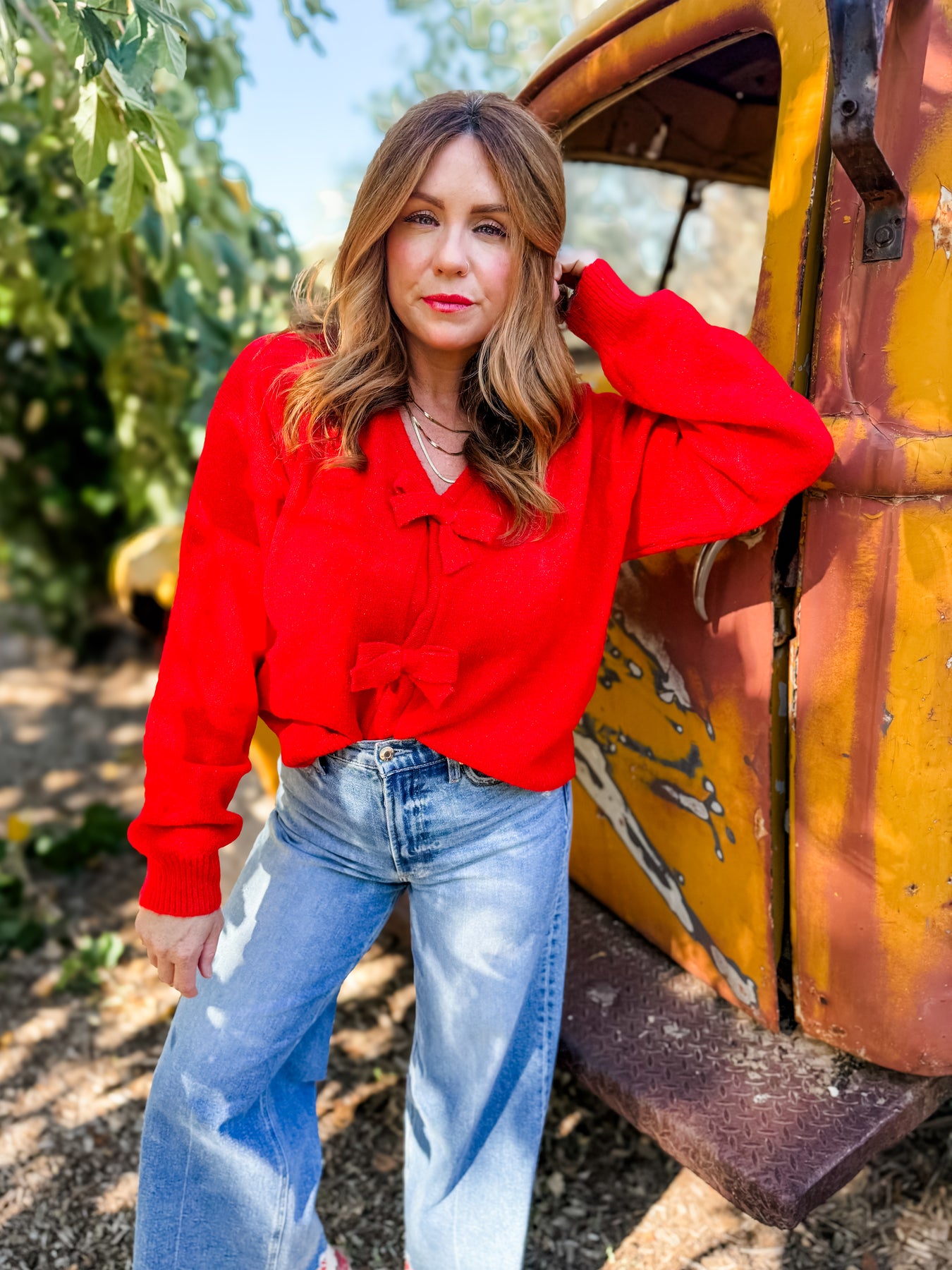 Get festive in the Put A Bow On It Sweater! This bold red knit sweater features front cutouts with a cute bow detail and snap button closure. A fun way to add a pop of color to your looks this holiday season. Versatile and cozy, this sweater will have you feeling merry and bright. Pair with denim, a skirt and wear casual or dressed up for a night out.