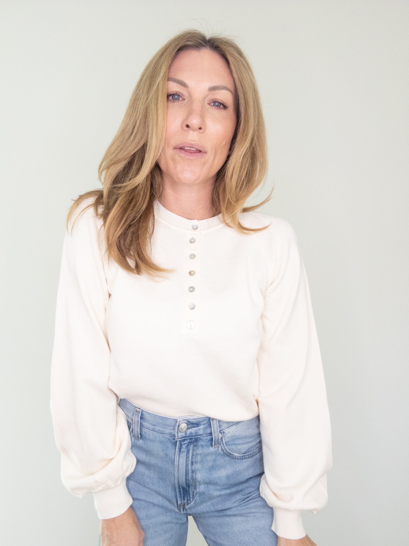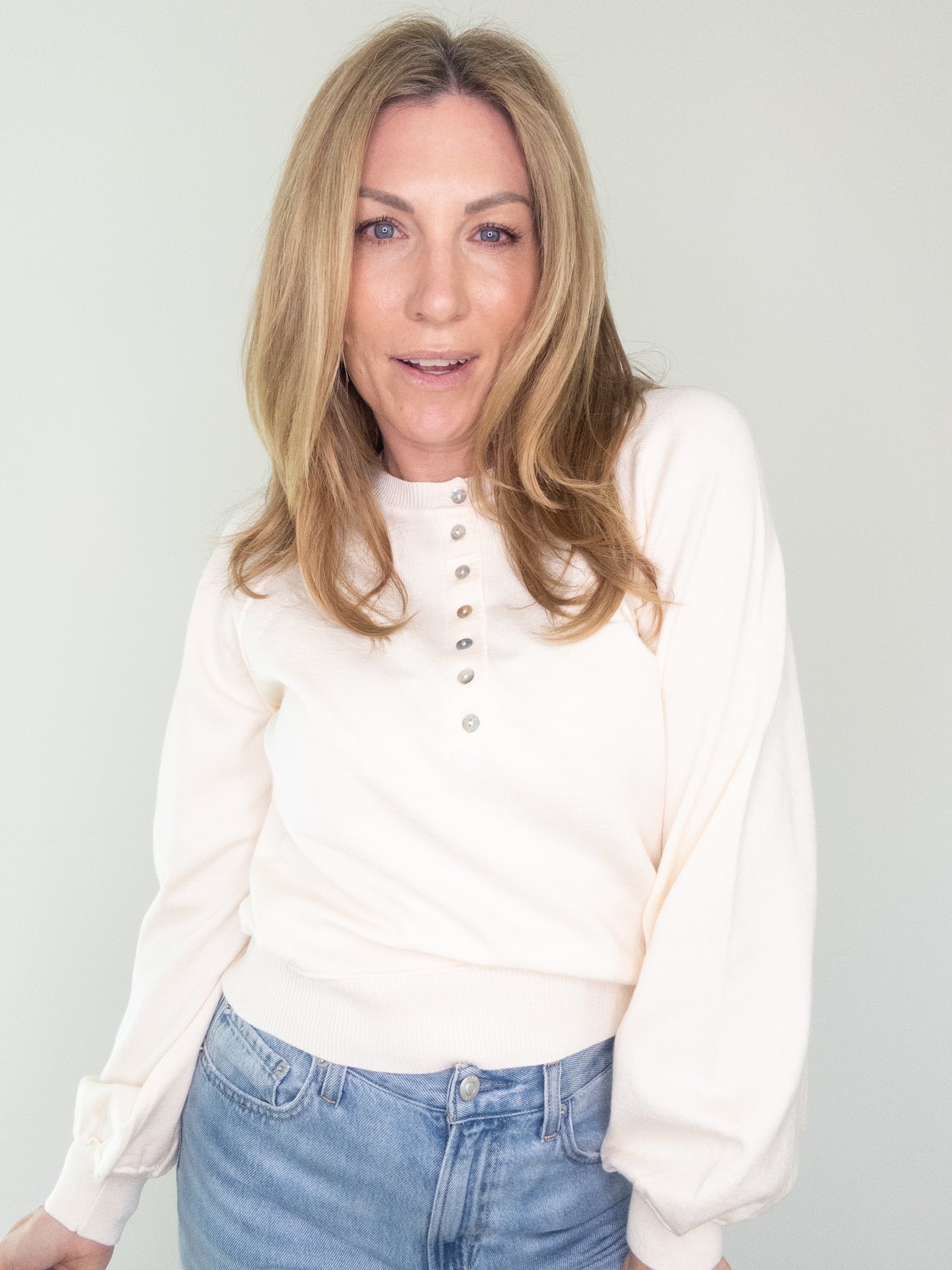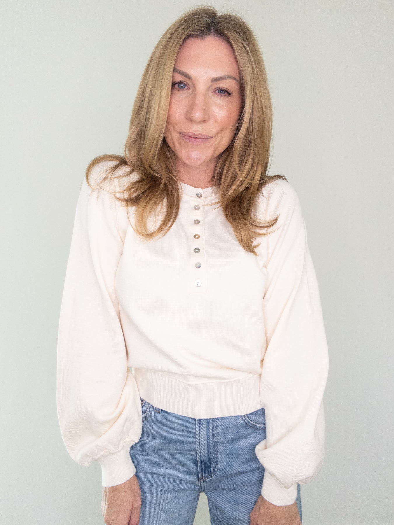 Effortlessly polished with a touch of cozy charm, this soft luxe henley sweater is a closet essential you’ll reach for again and again. Designed in a creamy neutral tone, it features delicate functional buttons down the front, a flattering relaxed fit, and subtly puffed sleeves with ribbed cuffs for a feminine finish. The lightweight knit feels smooth and comfortable, making it perfect for layering or wearing on its own.