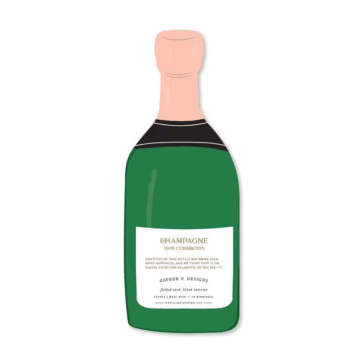 A bottle of champagne in paper form is the only way to cheers with someone! And we love the added details on the back that describe the "contents" of the champagne. Folded, die-cut greeting card