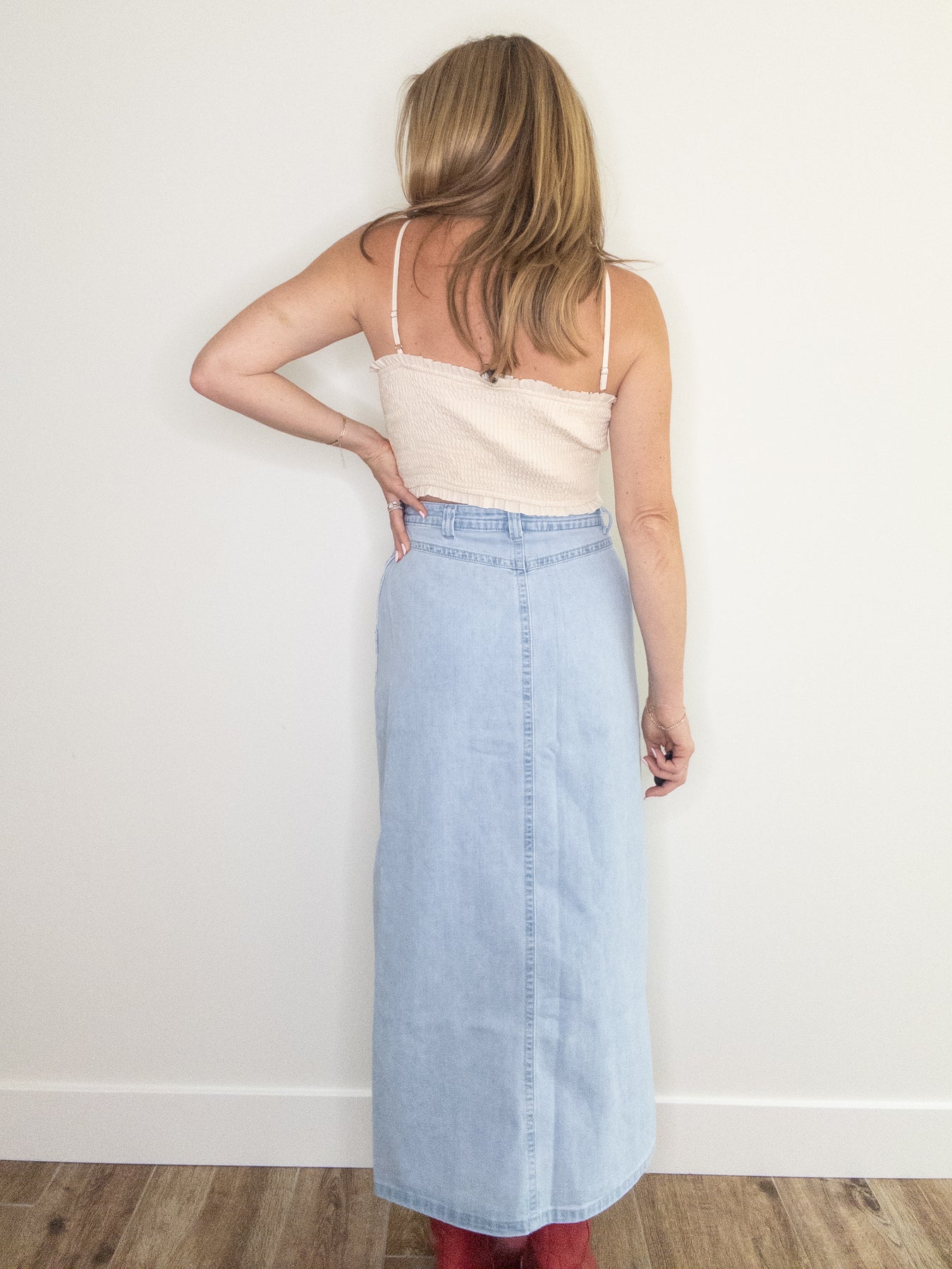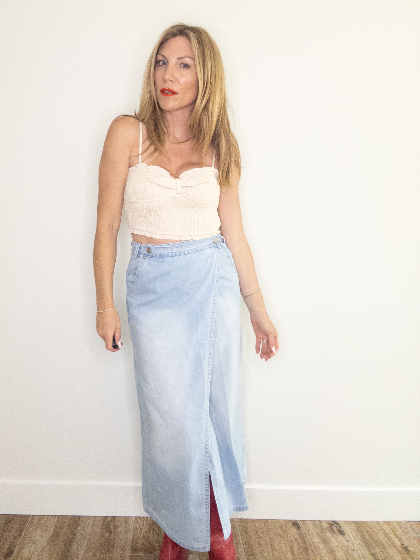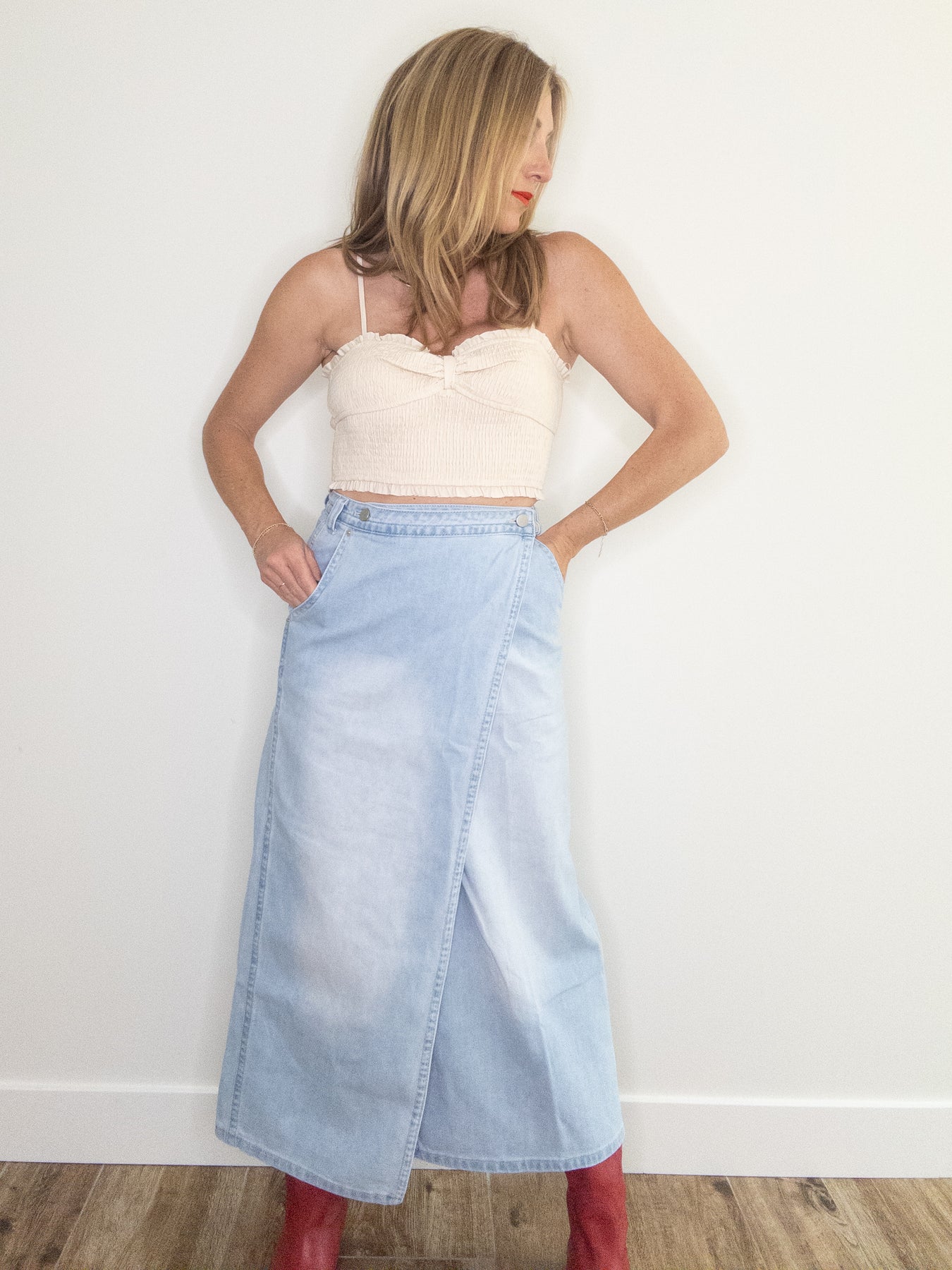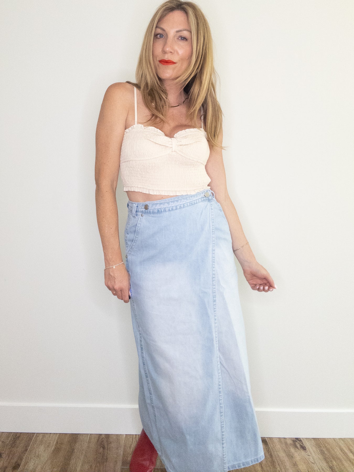 This long denim midi skirt is going to look good on you girl! Available in a light wash denim with an overlap detail at the front, side pockets and button closure. A versatile piece that pairs well with a tank and boots or a graphic tee and some sneakers, we love this casual everyday skirt that can incorporated into any look.