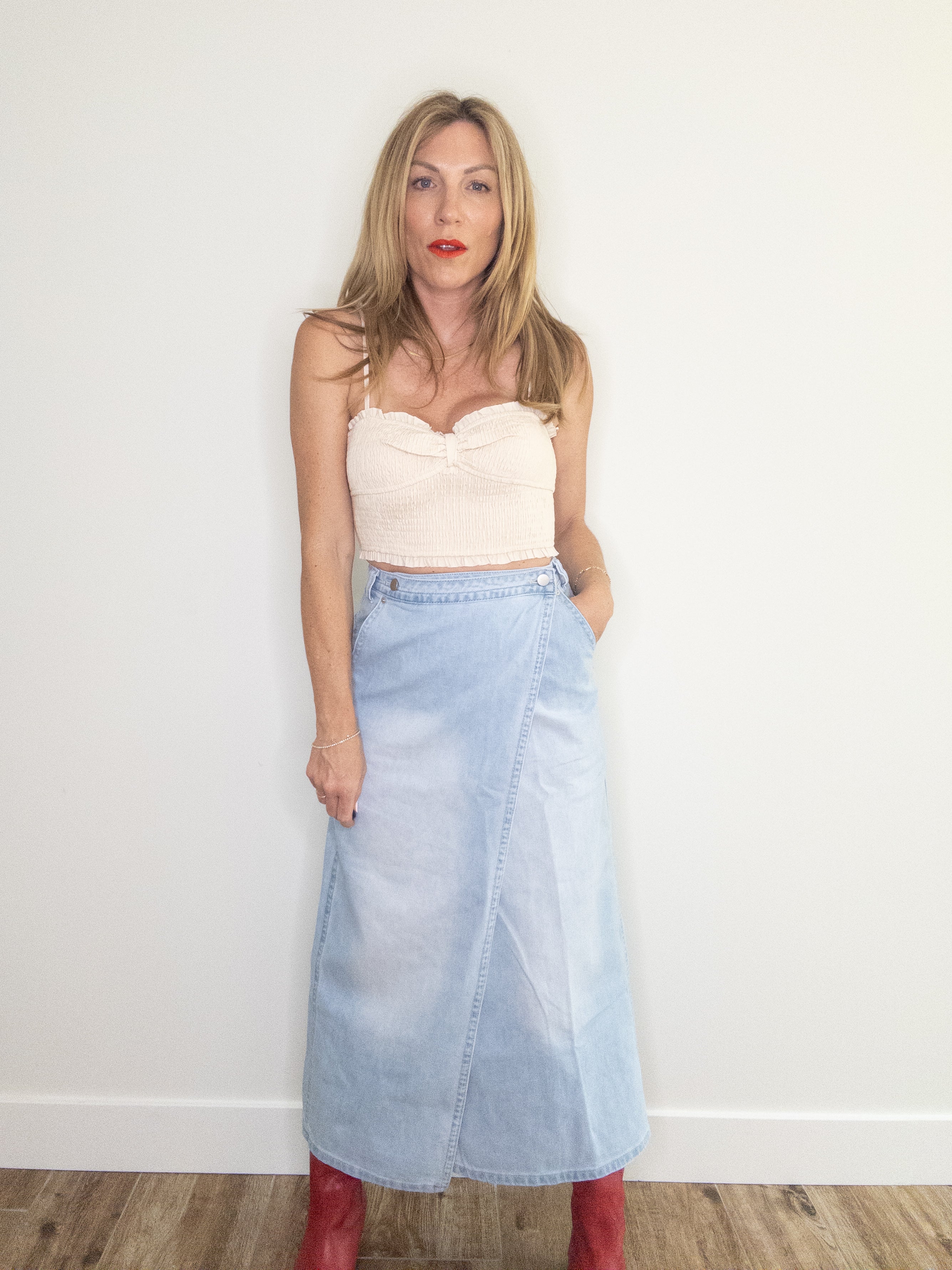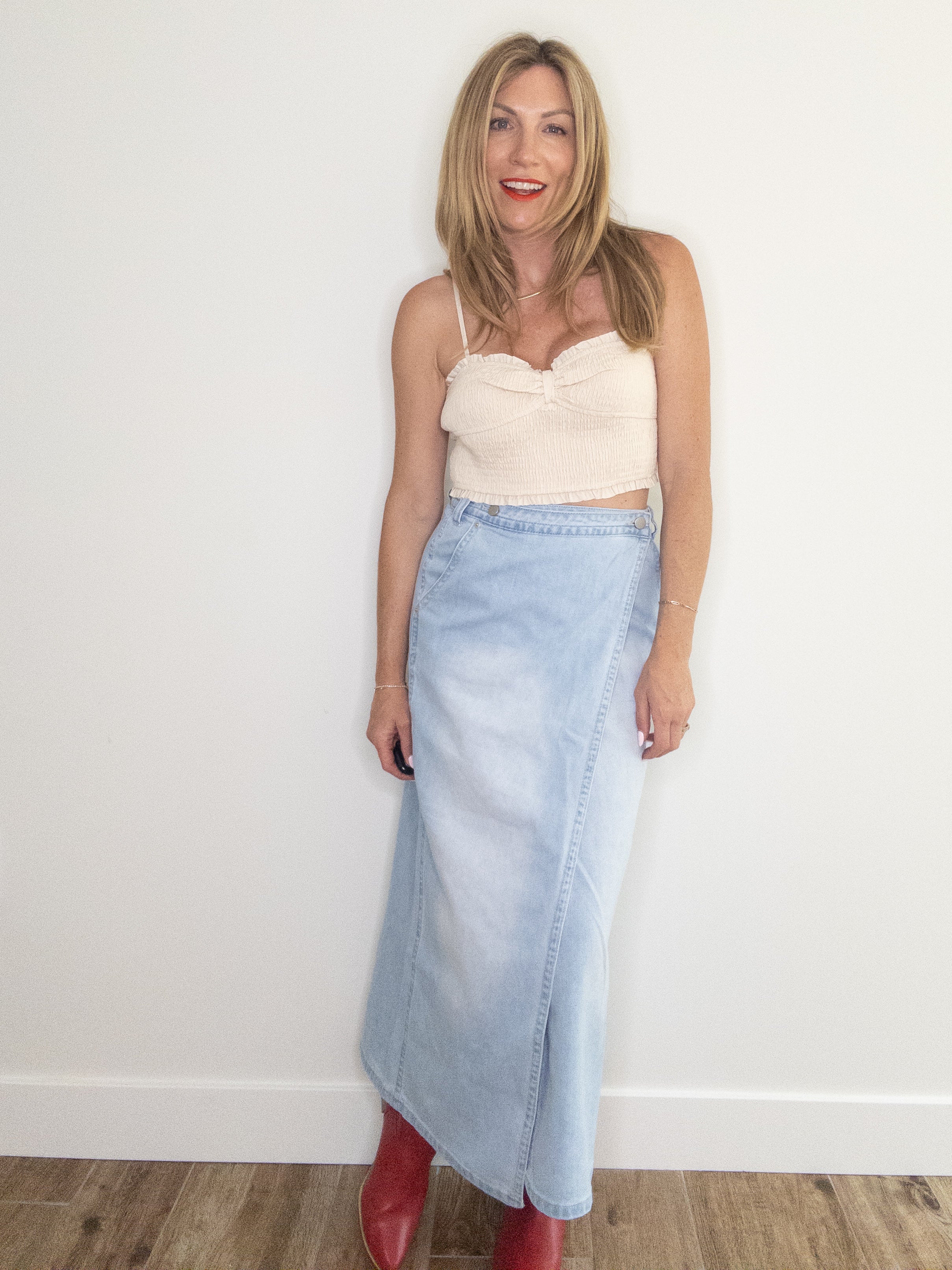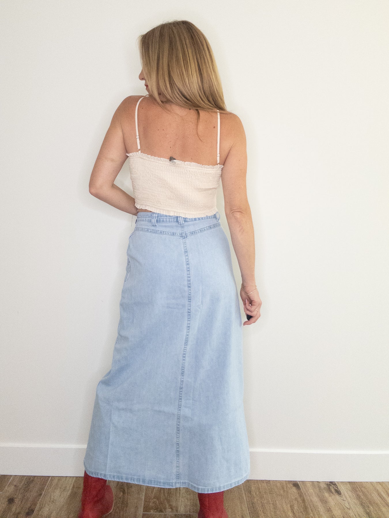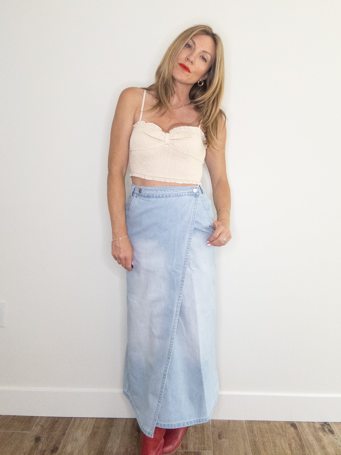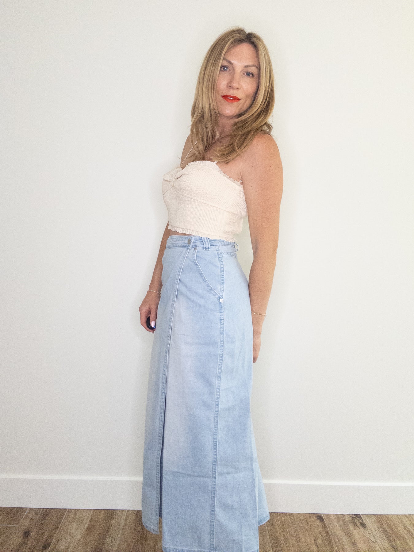 This long denim midi skirt is going to look good on you girl! Available in a light wash denim with an overlap detail at the front, side pockets and button closure. A versatile piece that pairs well with a tank and boots or a graphic tee and some sneakers, we love this casual everyday skirt that can incorporated into any look.