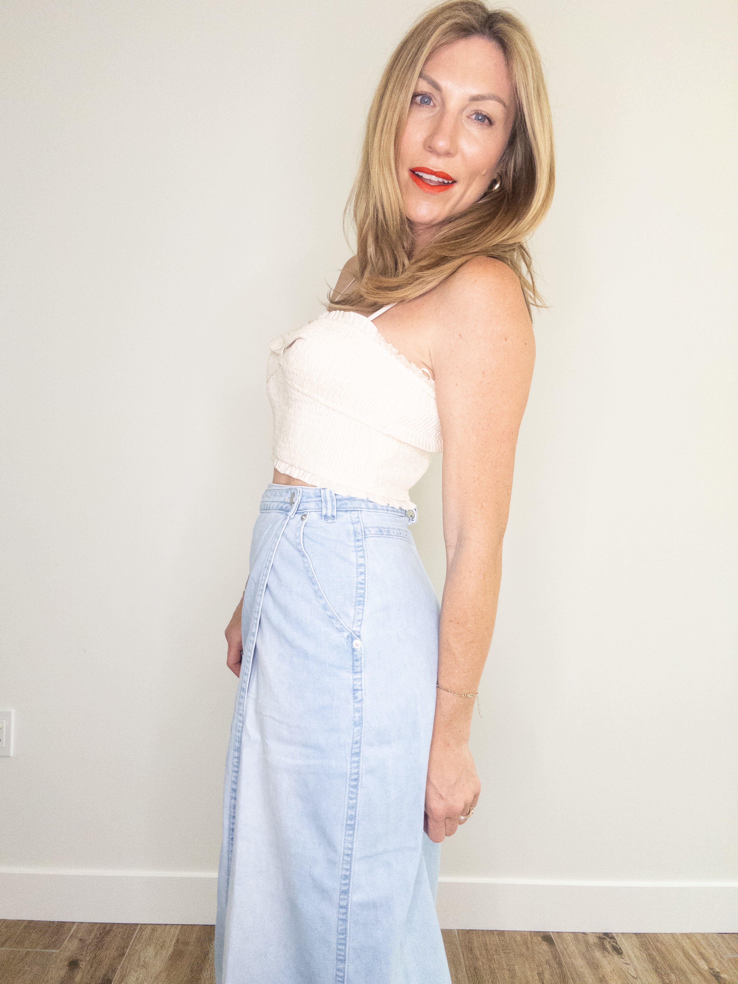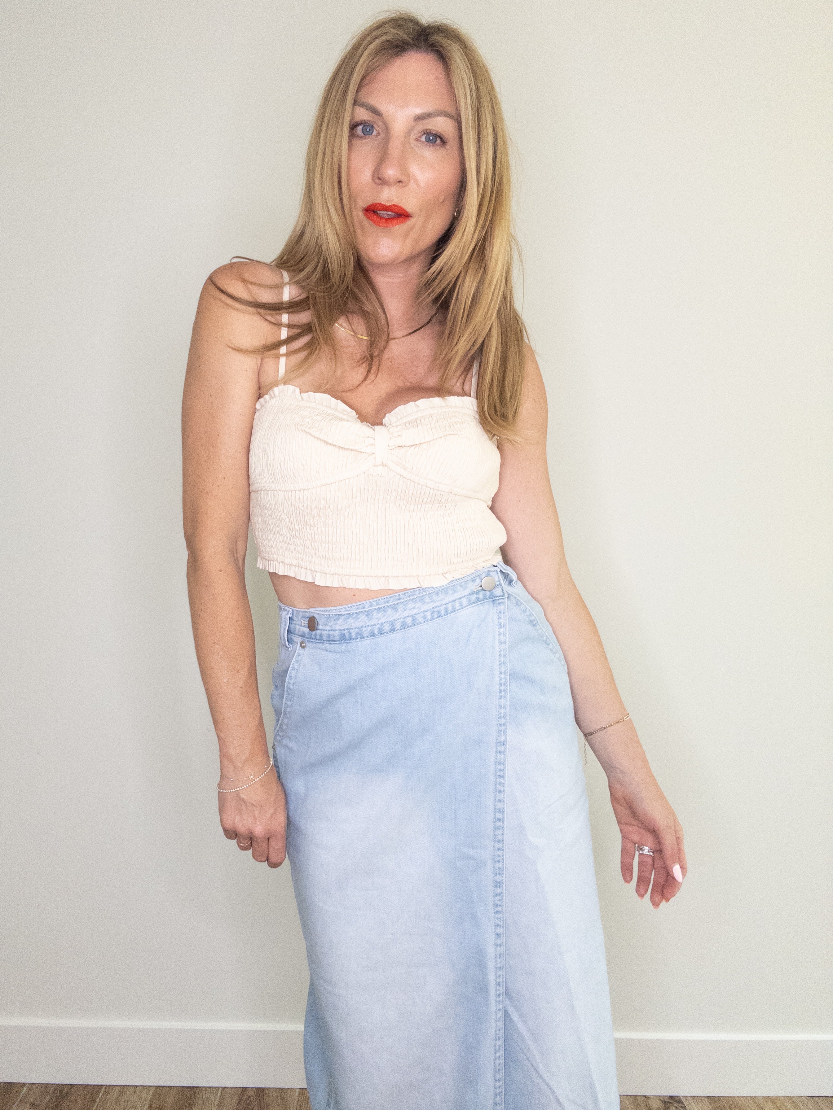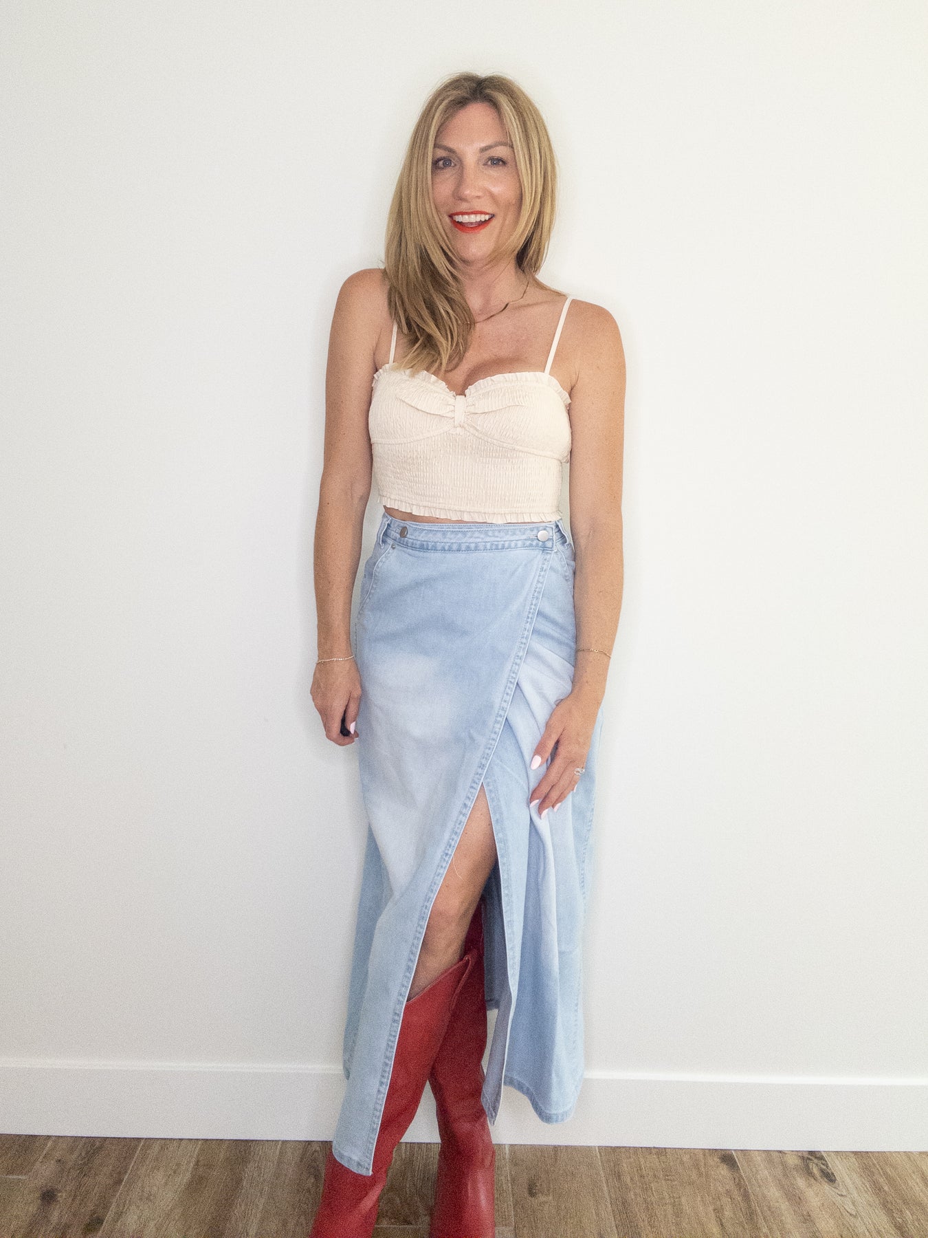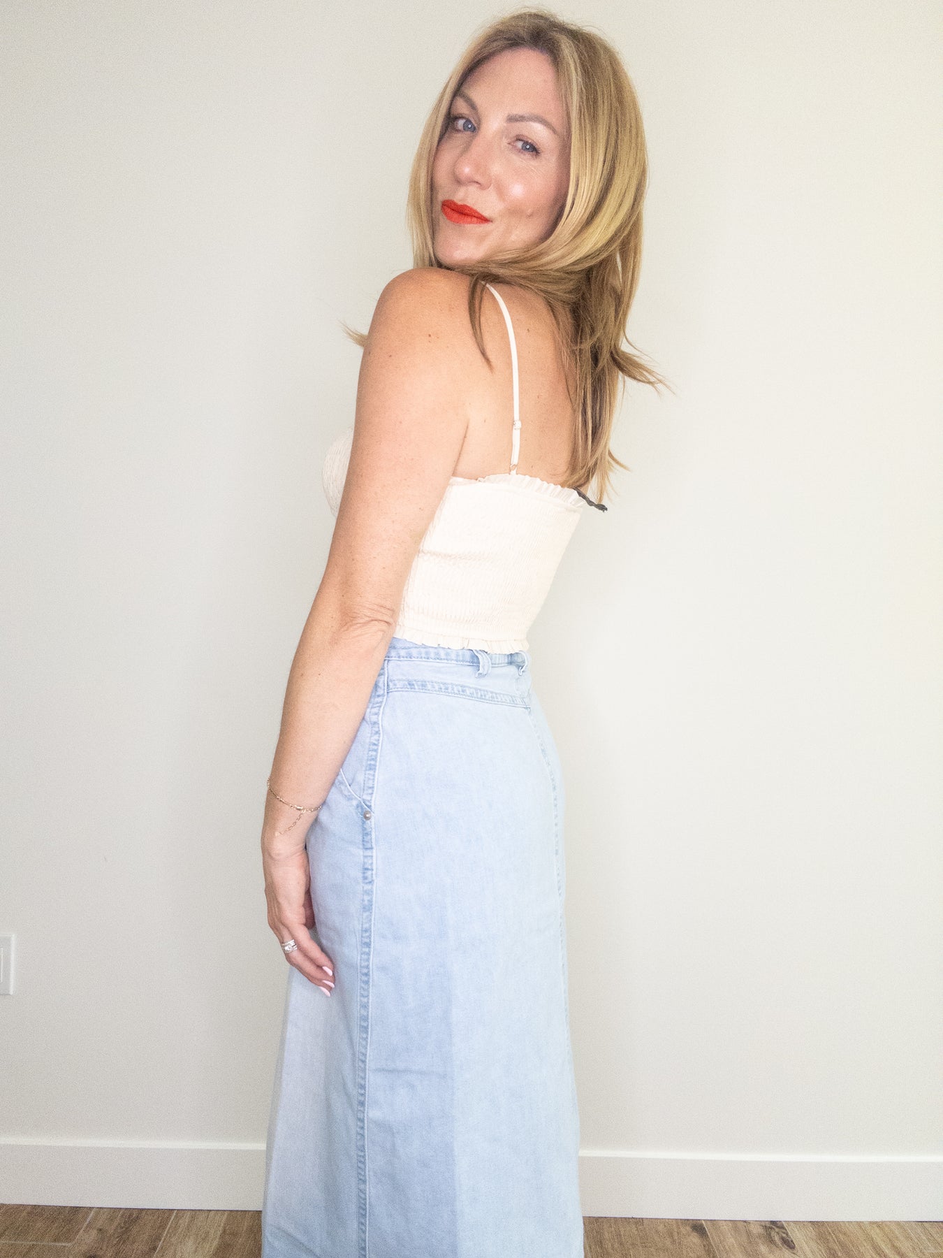This long denim midi skirt is going to look good on you girl! Available in a light wash denim with an overlap detail at the front, side pockets and button closure. A versatile piece that pairs well with a tank and boots or a graphic tee and some sneakers, we love this casual everyday skirt that can incorporated into any look.
