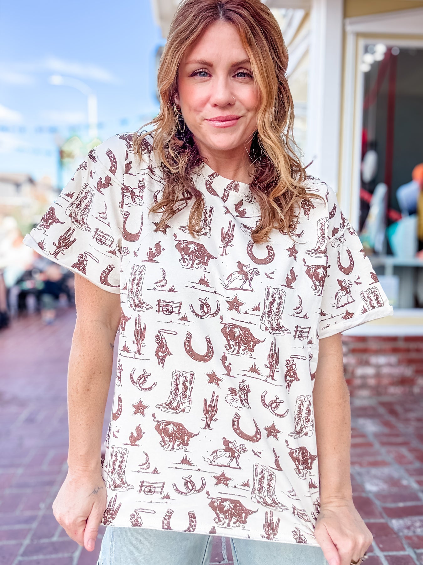 Why we LOVE it: This oversized graphic tee is perfect for any rodeo lover. The Rodeo Queen is an oversized boxy tee with neutral cowboy essentials on it. Featuring horseshoes, bulls, wrangles, cactus, stars, and cowboy boots, this tee is a relaxed look with rolled and distressed hems and a roundneck.